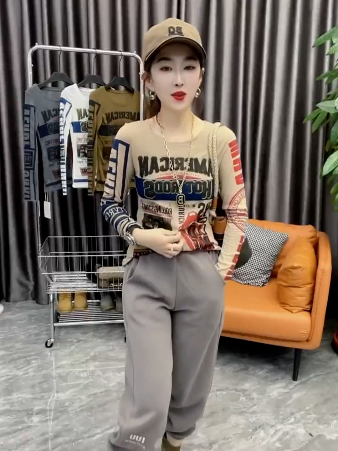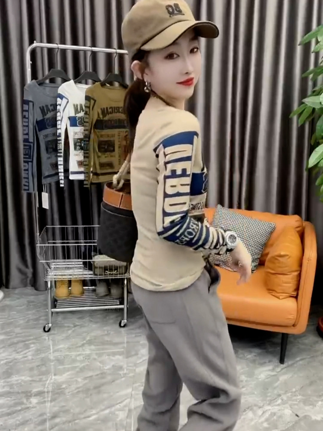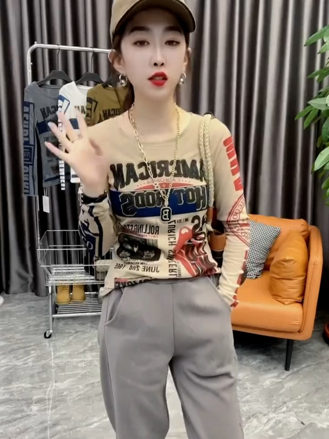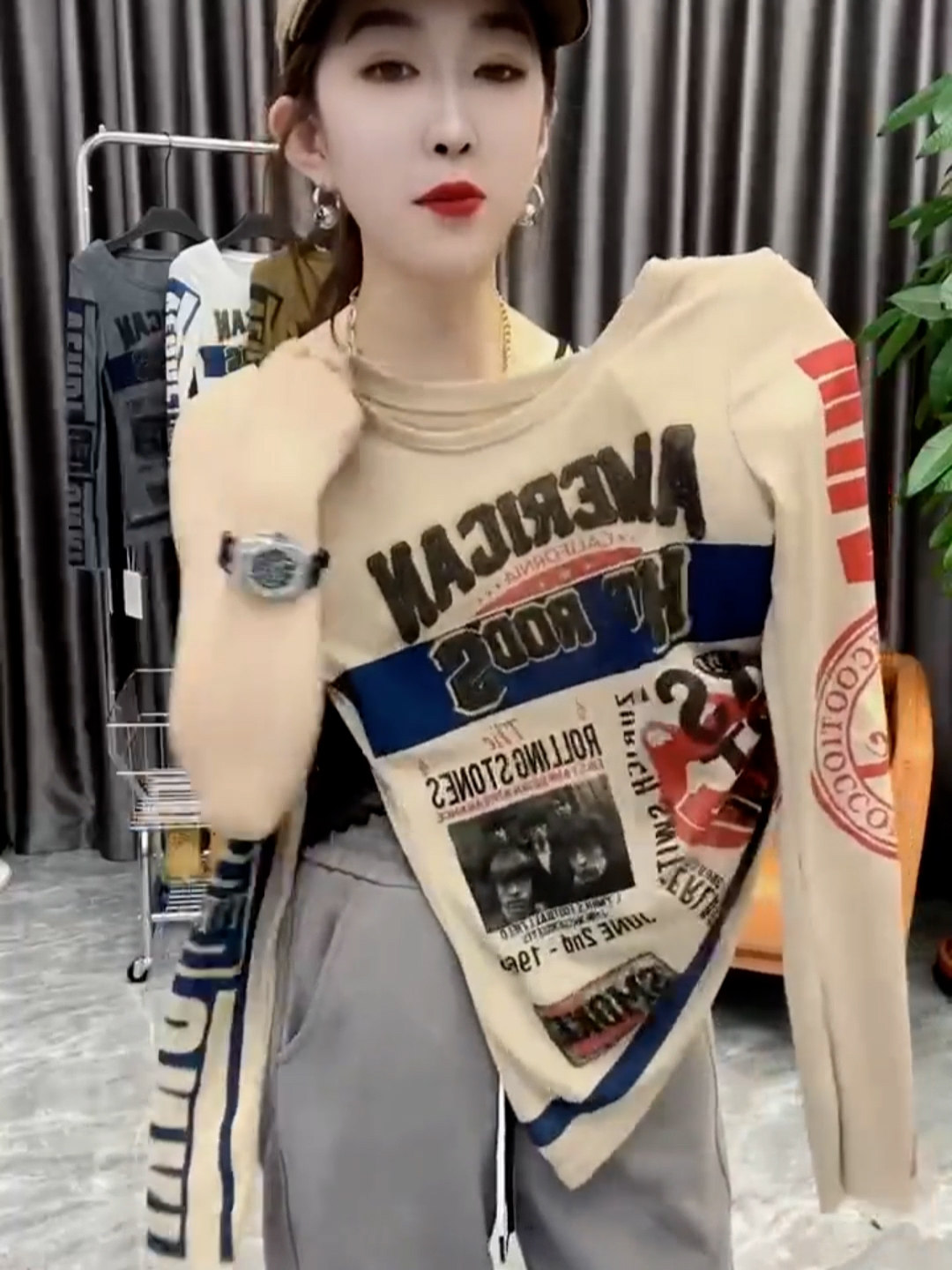 欧货2026早春新款涂鸦字母印花纯棉长袖T恤女修身显瘦插肩袖上衣