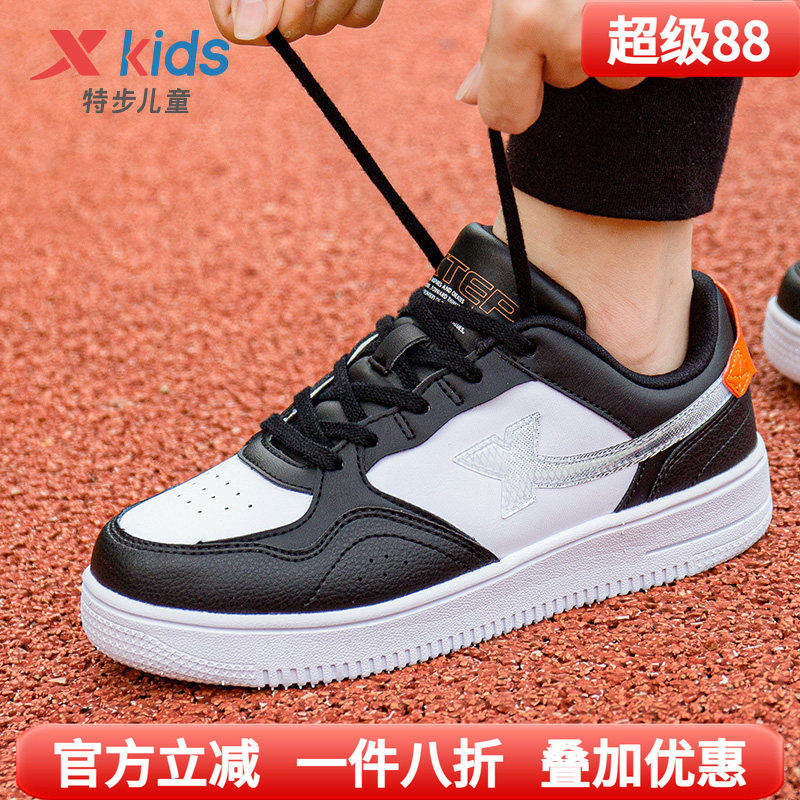 特步童鞋春季白色儿童休闲板鞋学生男童小白鞋皮面防水女童运动鞋