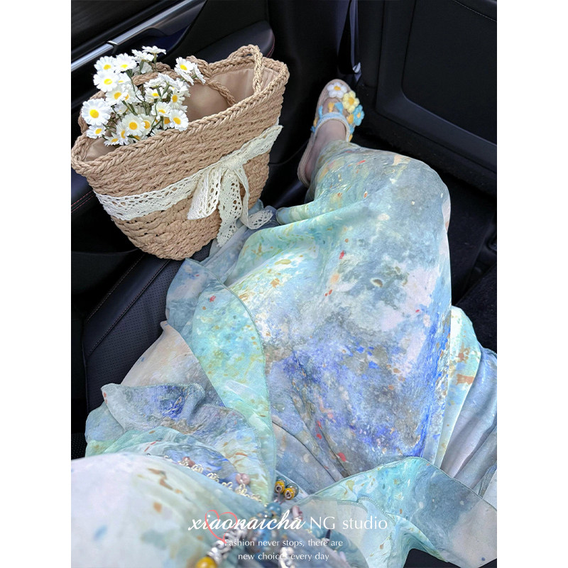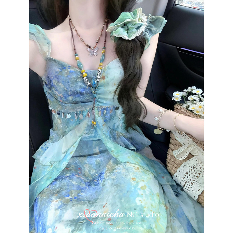 海边度假风印花小飞袖吊带连衣裙女2026夏季新款收腰仙女长裙子