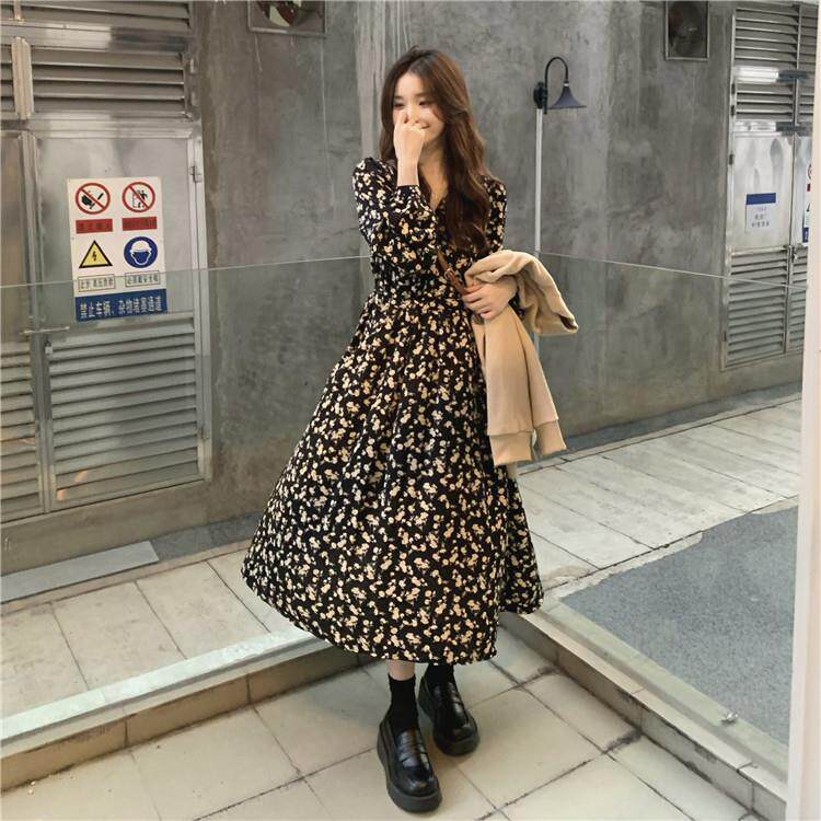 小个子法式复古黑色碎花v领连衣裙长袖收腰中长裙xs码春