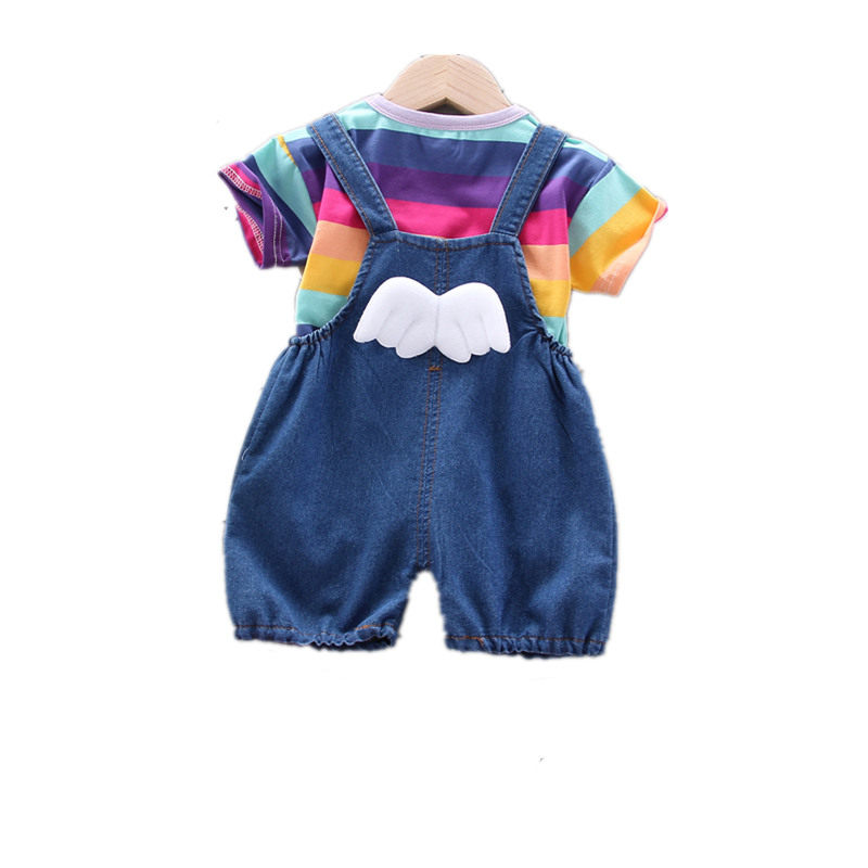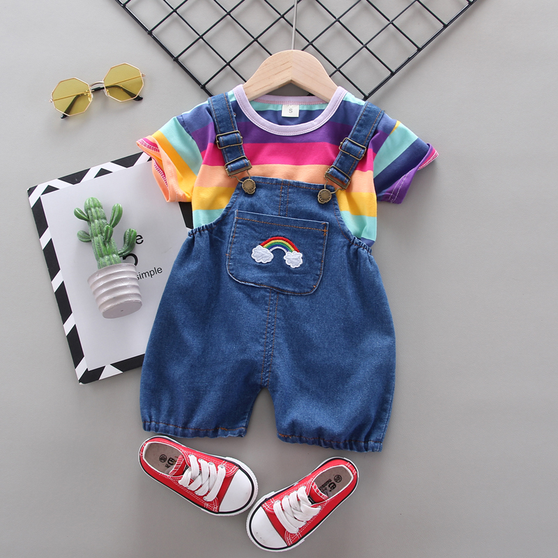 女童夏季洋气短袖套装婴幼儿童夏装时髦宝宝牛仔背带短裤两件套潮