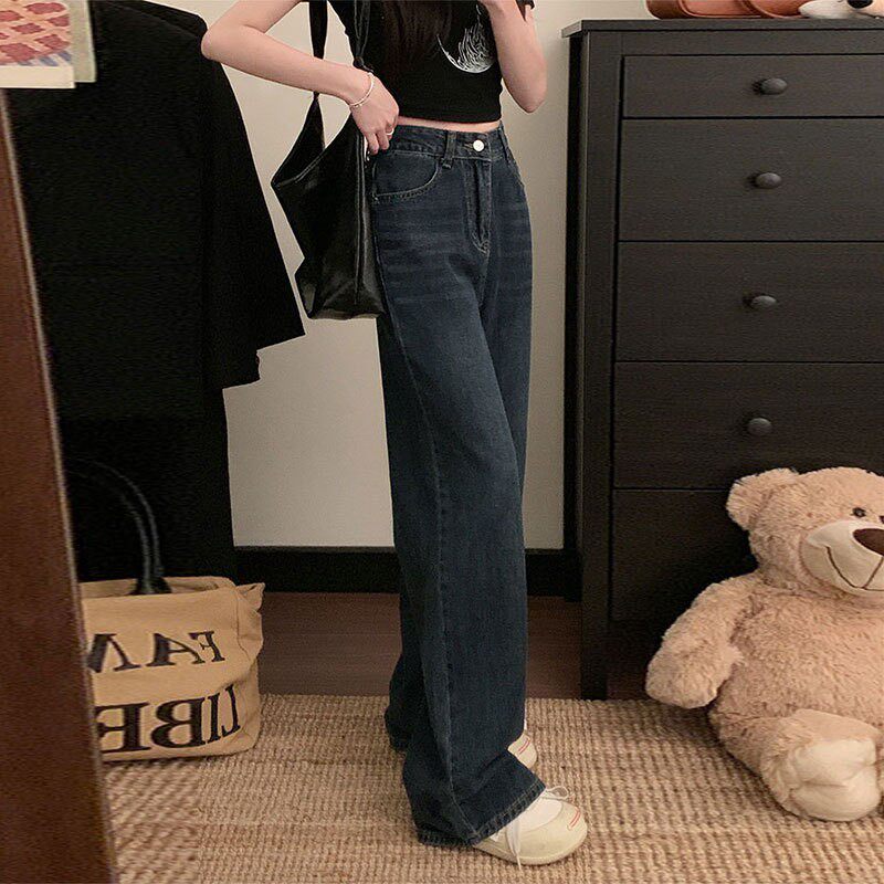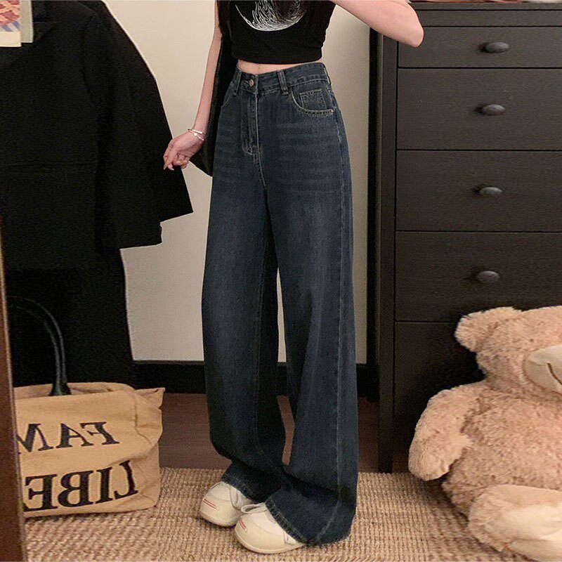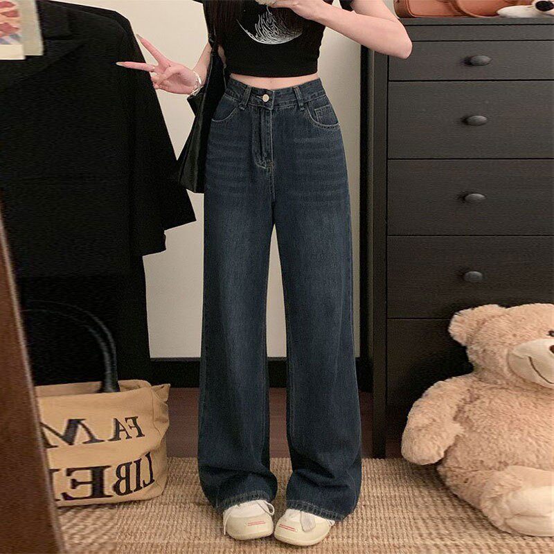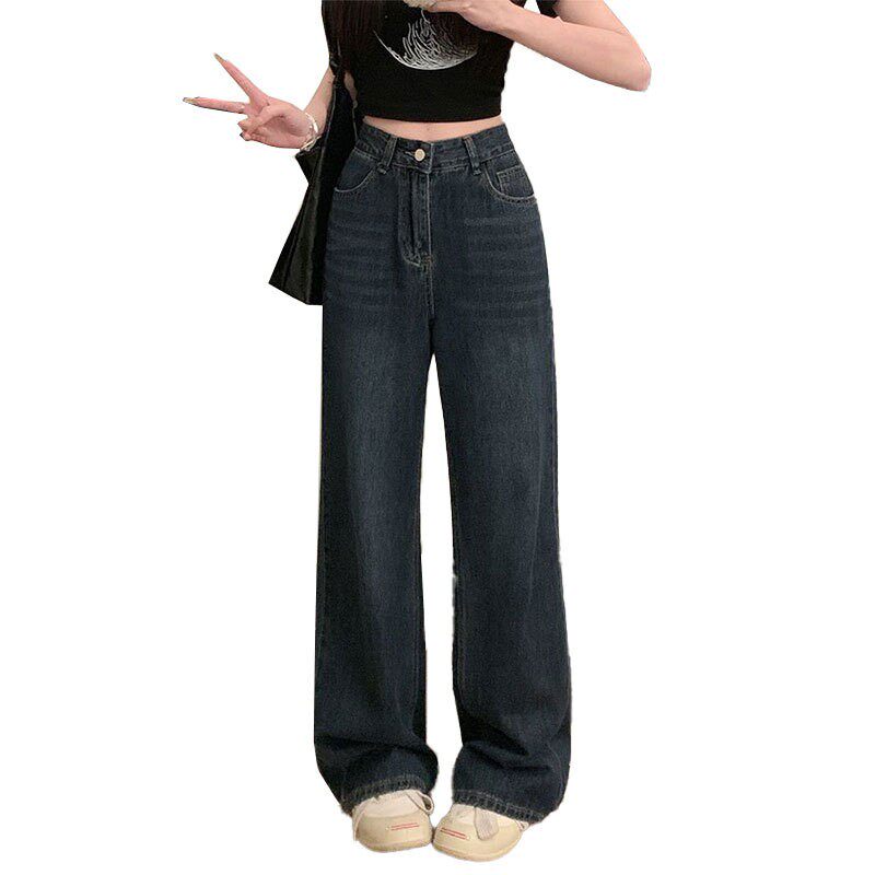 2026春装新款宽松显瘦设计感蓝灰色直筒牛仔裤女款大码阔腿长裤子
