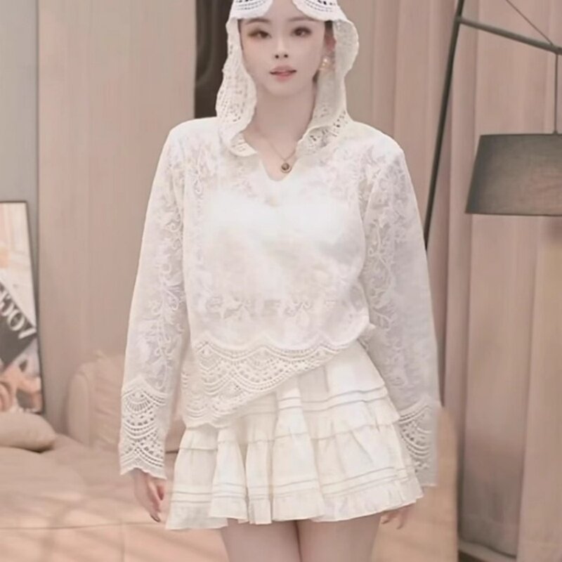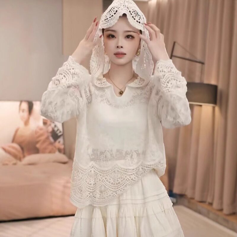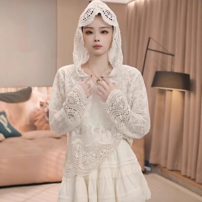 2026春季新款设计感钩花连帽蕾丝衫防晒修身温柔风洋气百搭上衣女