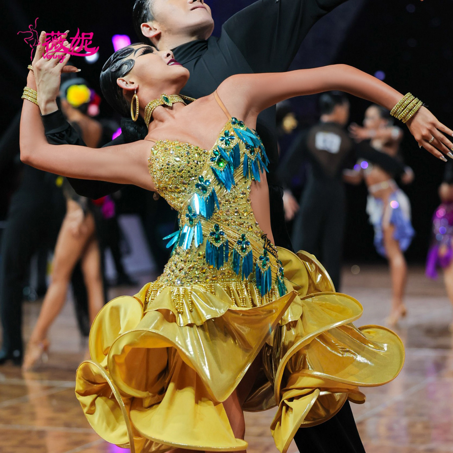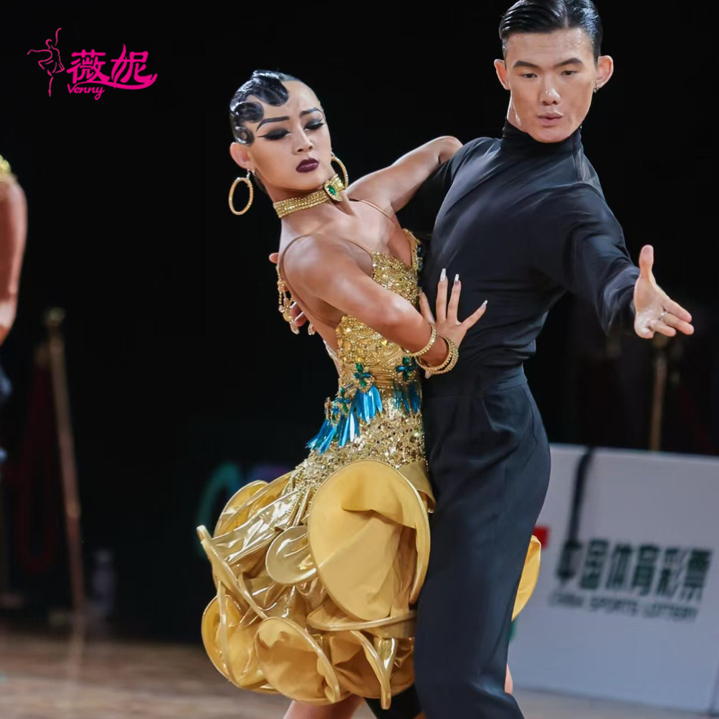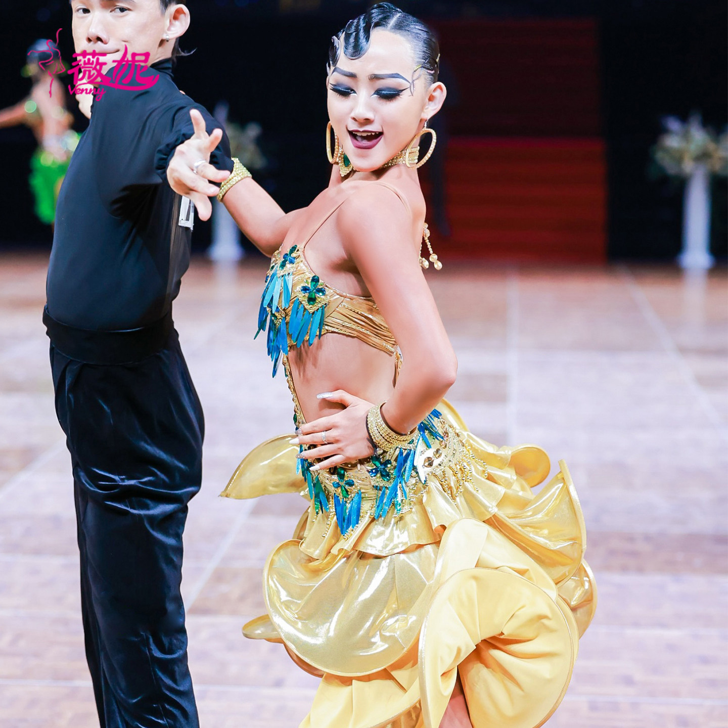 Venny薇妮拉丁舞蹈比赛服黄色镶钻亮片演出服艺考大裙摆连体花服
