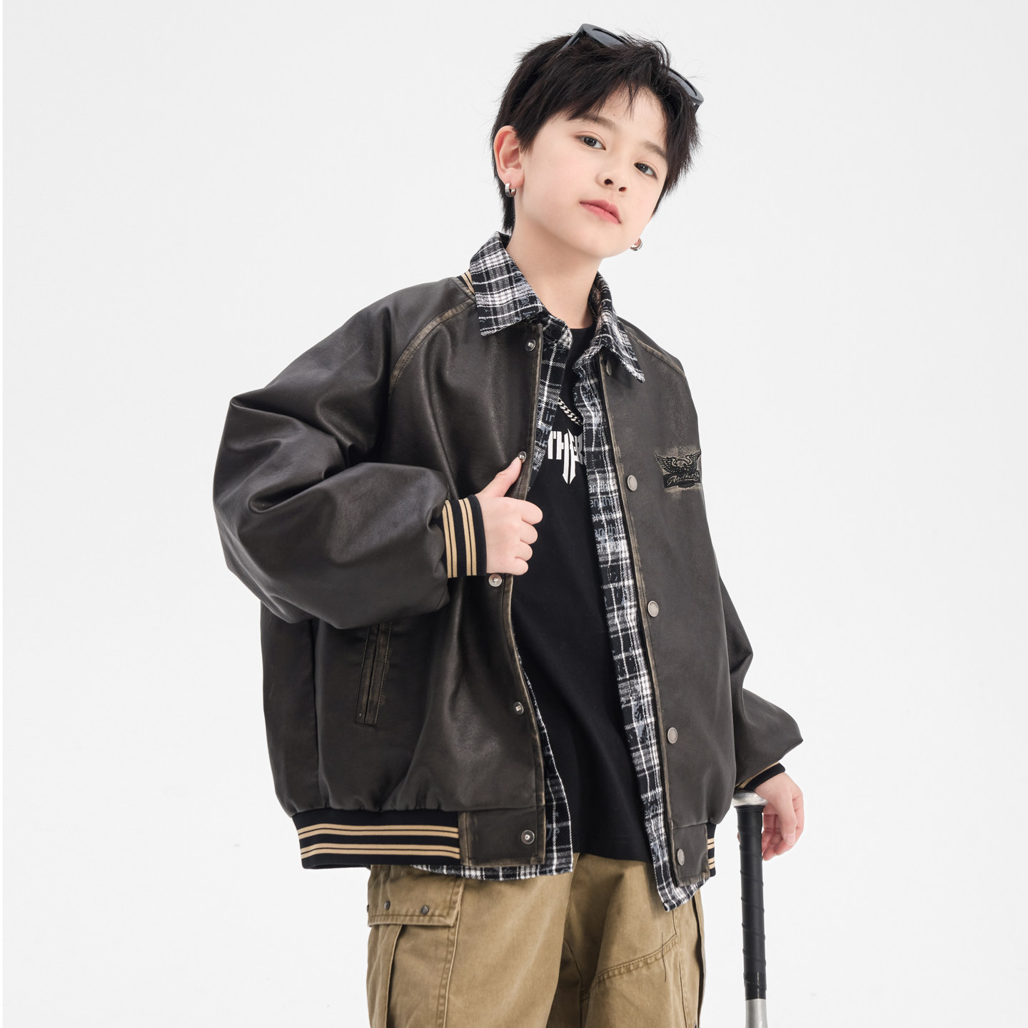 男童春装复古风棒球服皮衣外套2026新款青少年儿童运动撞色皮夹克