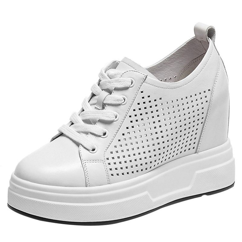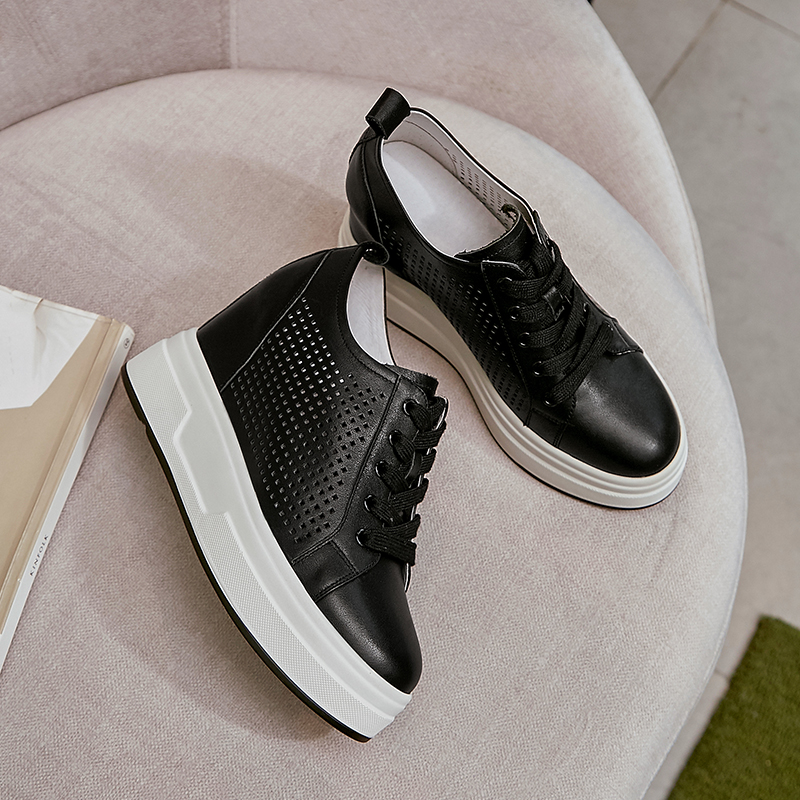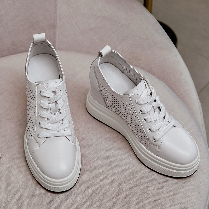 春夏镂空真皮内增高女鞋系带百搭单鞋9CM厚底松糕休闲鞋小白鞋潮