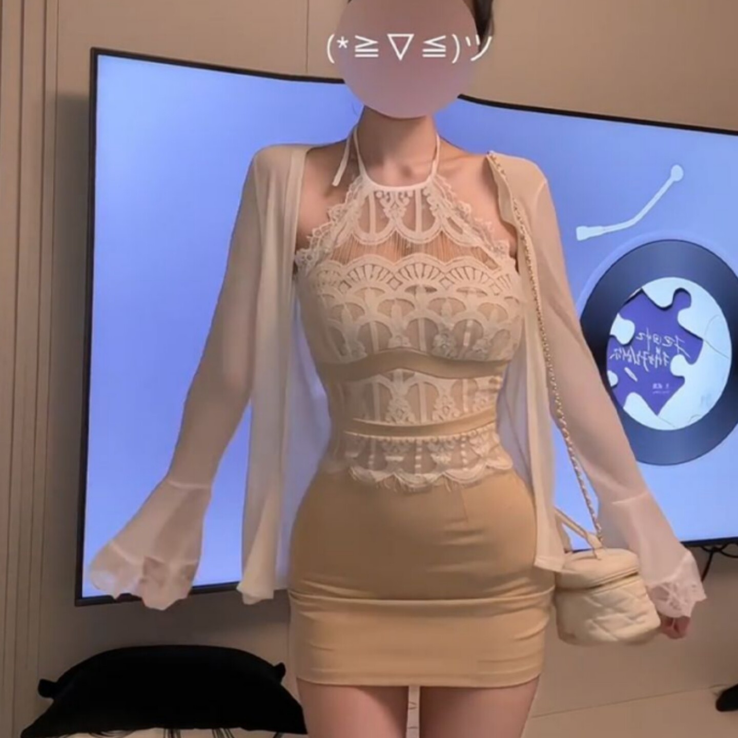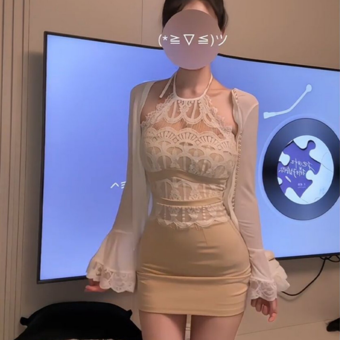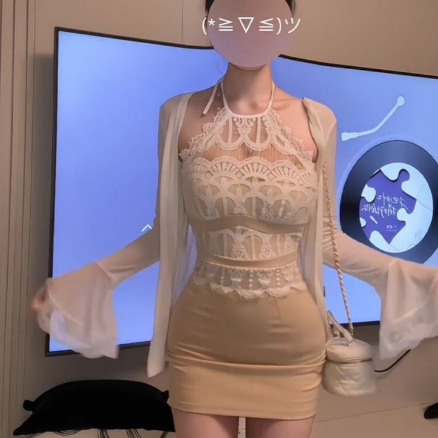 纯欲风性感套装女韩系甜辣妹修身蕾丝吊带连衣裙外搭长袖针织开衫