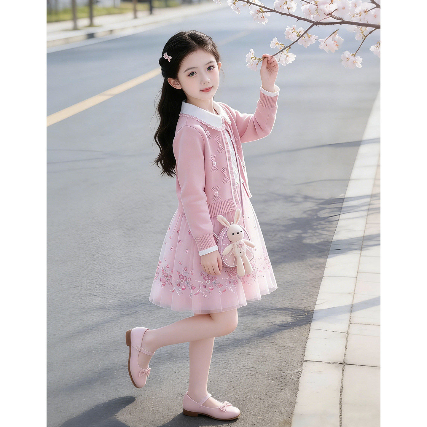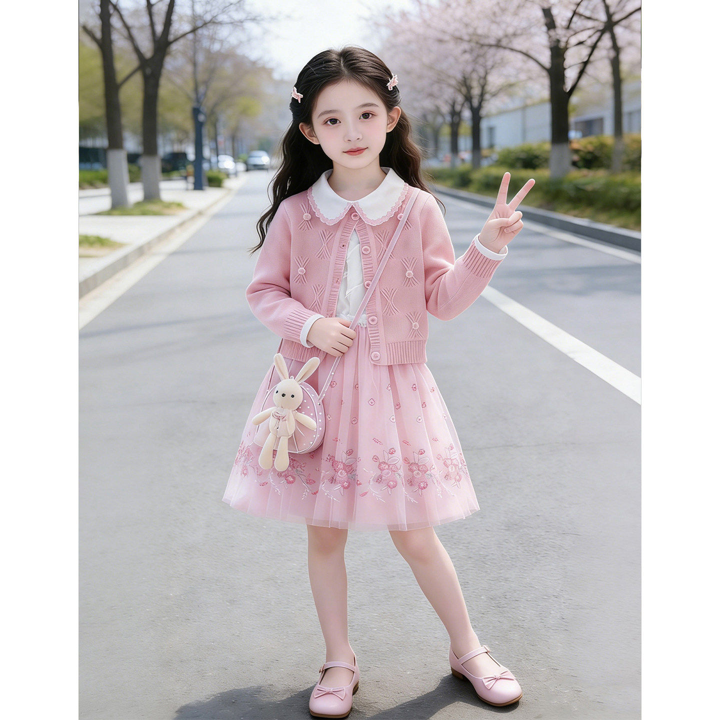女童连衣裙套装2026春季新款中大童韩系高级感针织开衫裙子两件套