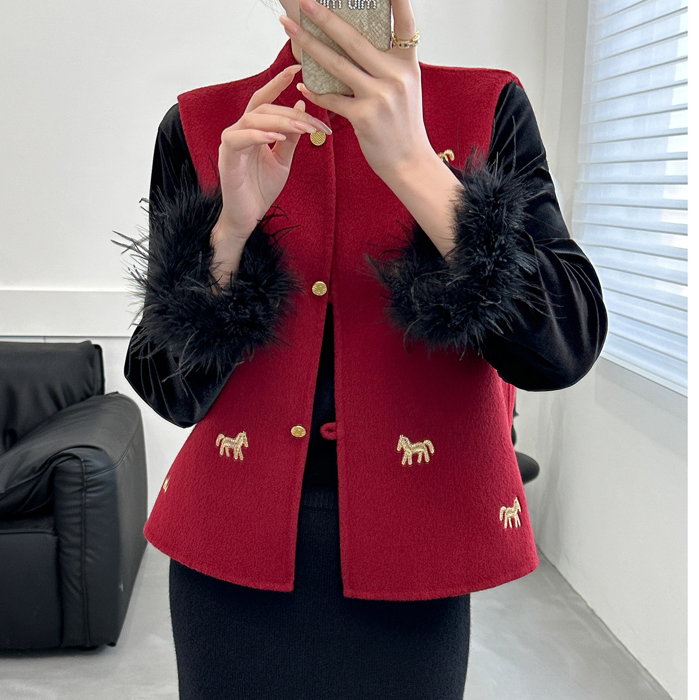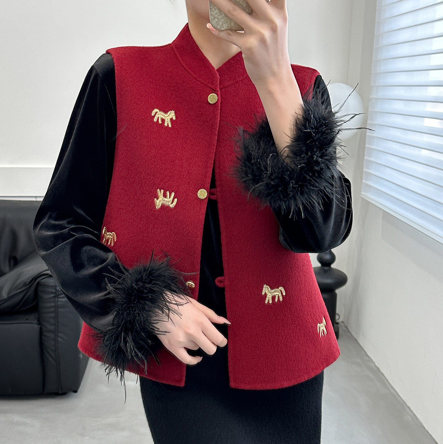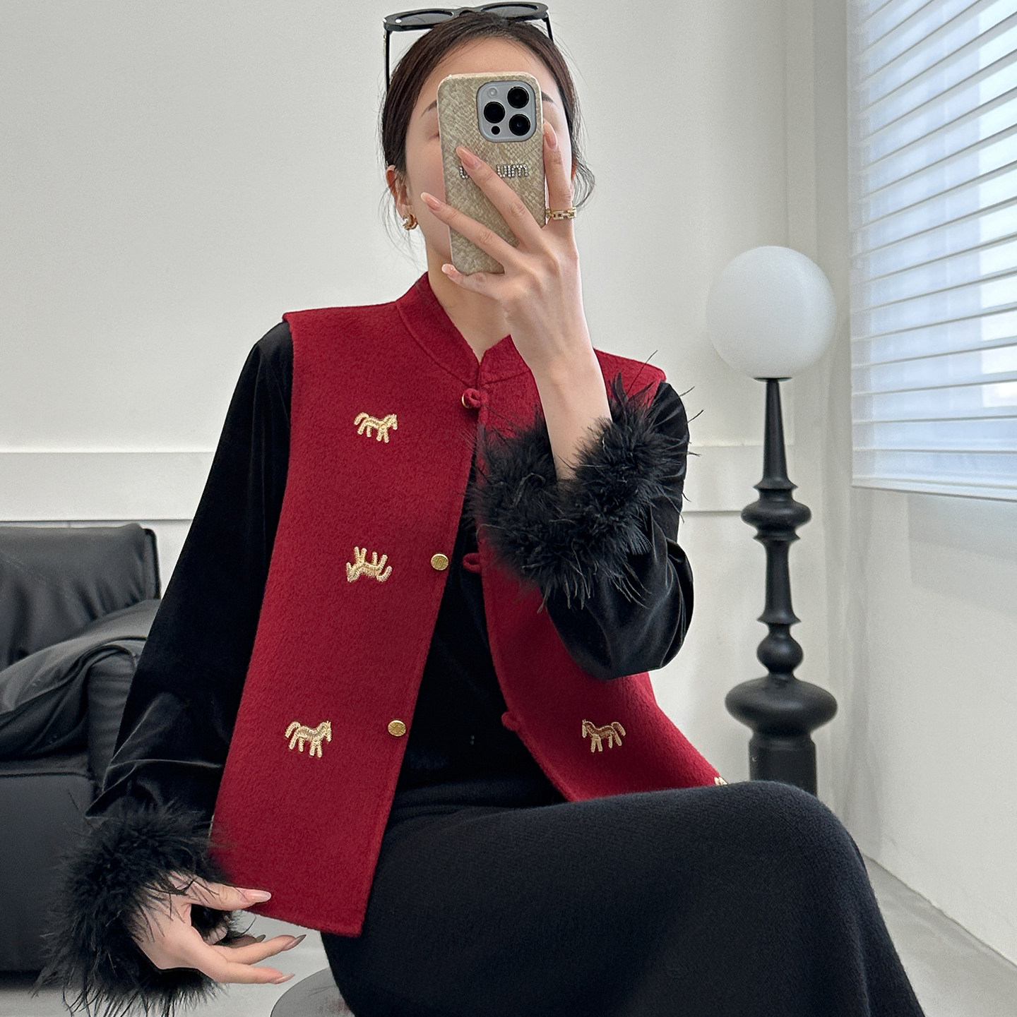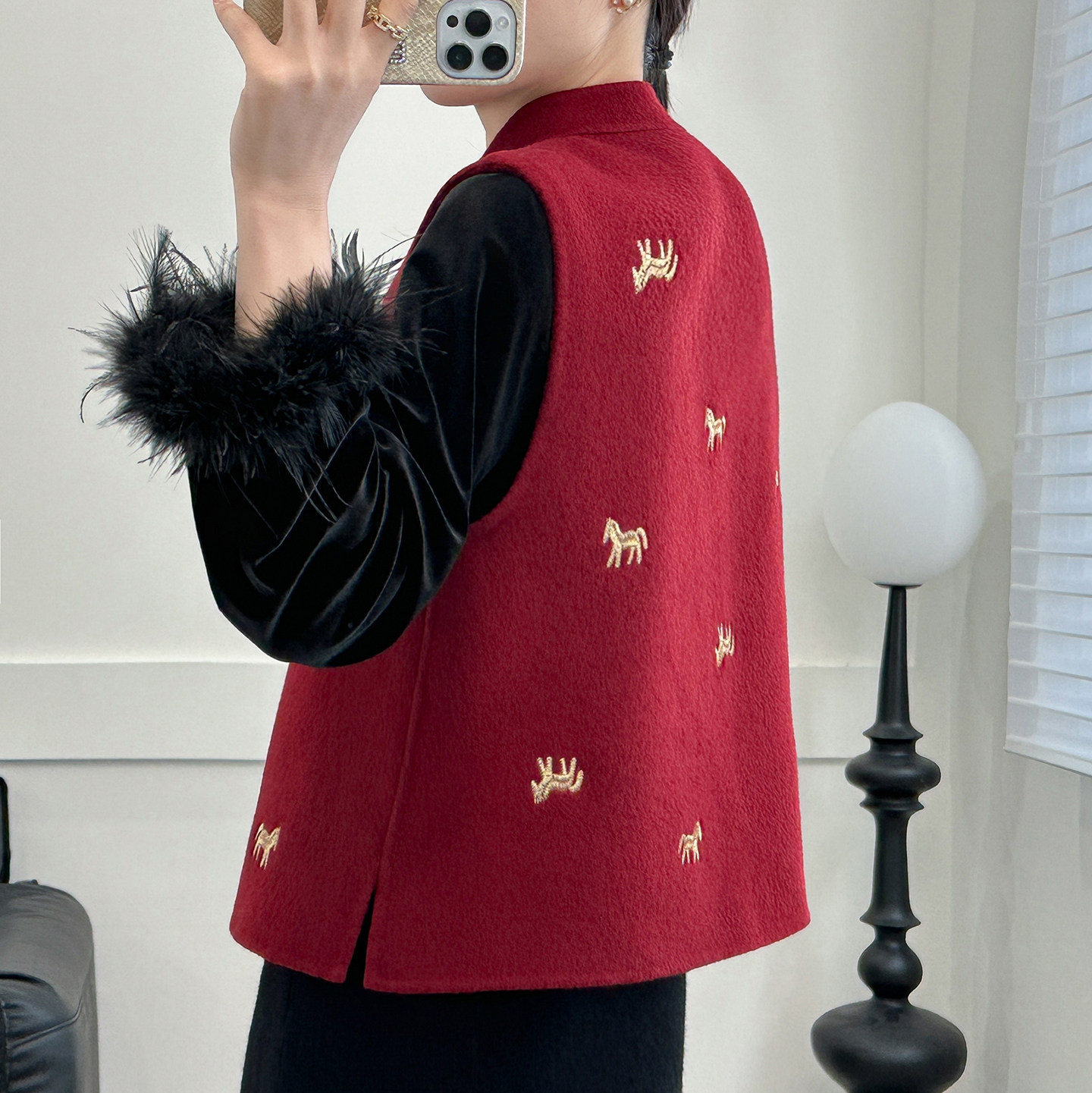 新中式红色小马刺绣双面羊毛马甲女短款2026新款国风毛呢短款外套