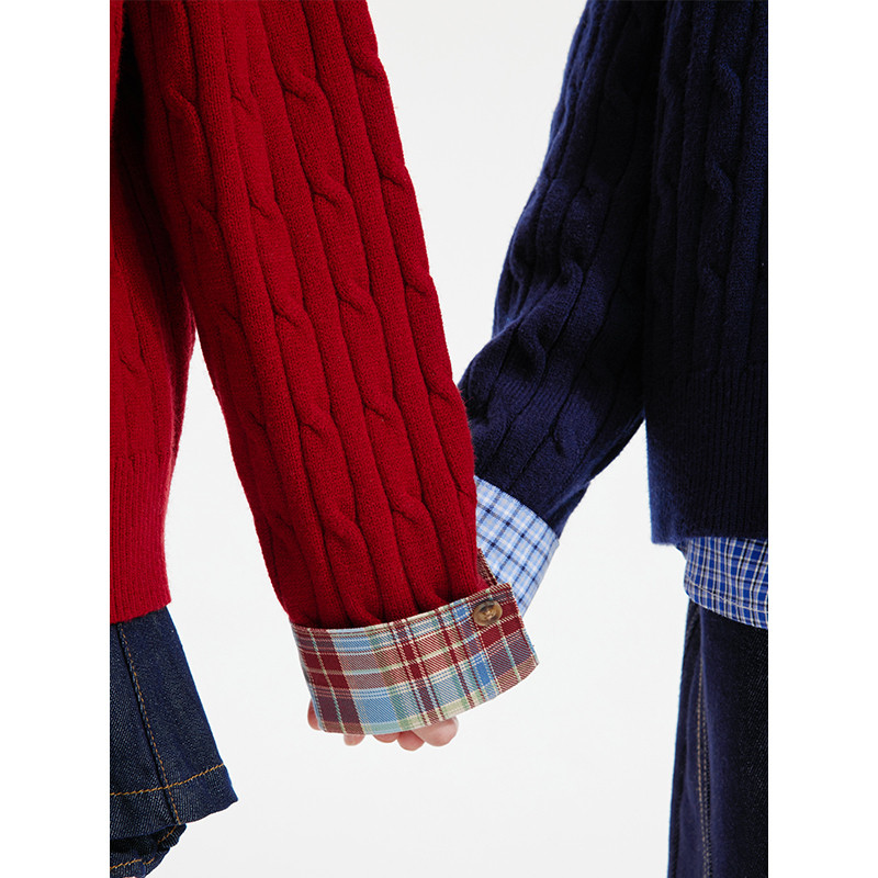 311线报网描述:男女童 秋冬拼格翻边袖绞花针织开衫毛衣