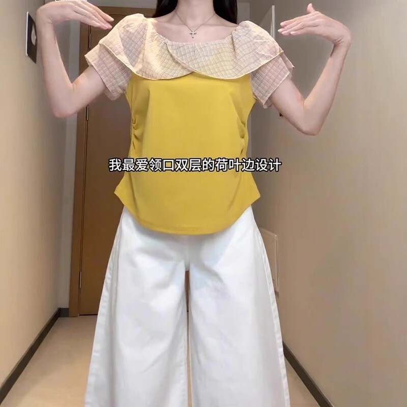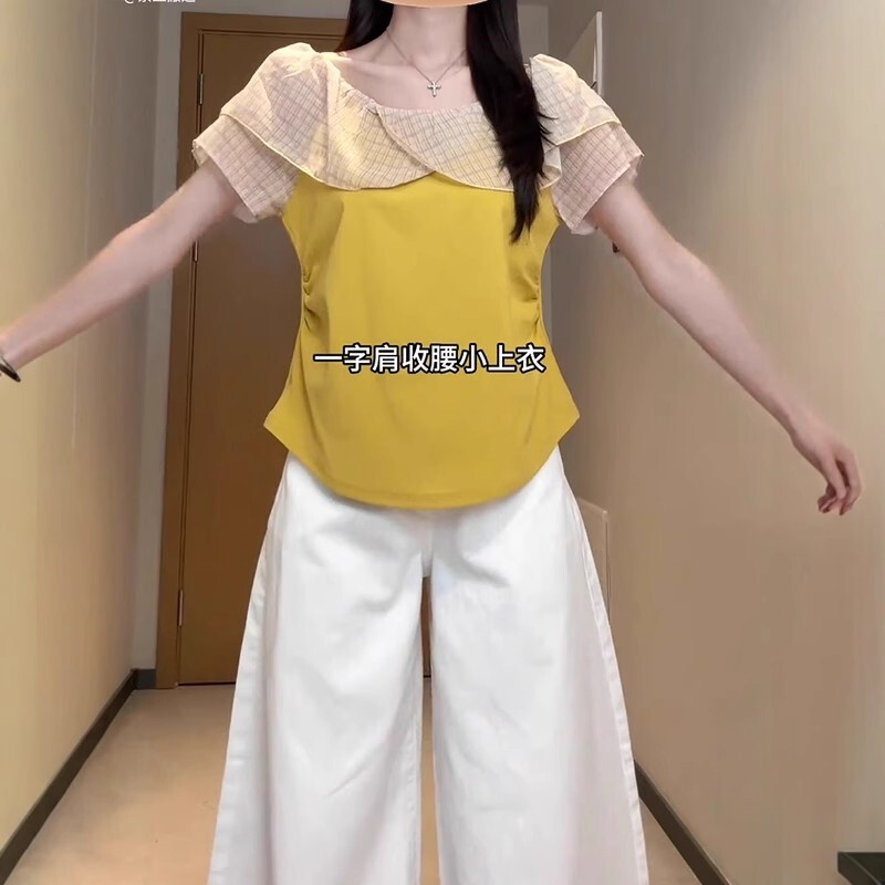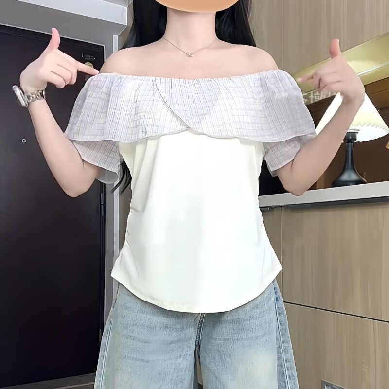 气质荷叶边拼接短袖T恤女款2026夏季遮肉收腰显瘦撞色一字肩上衣