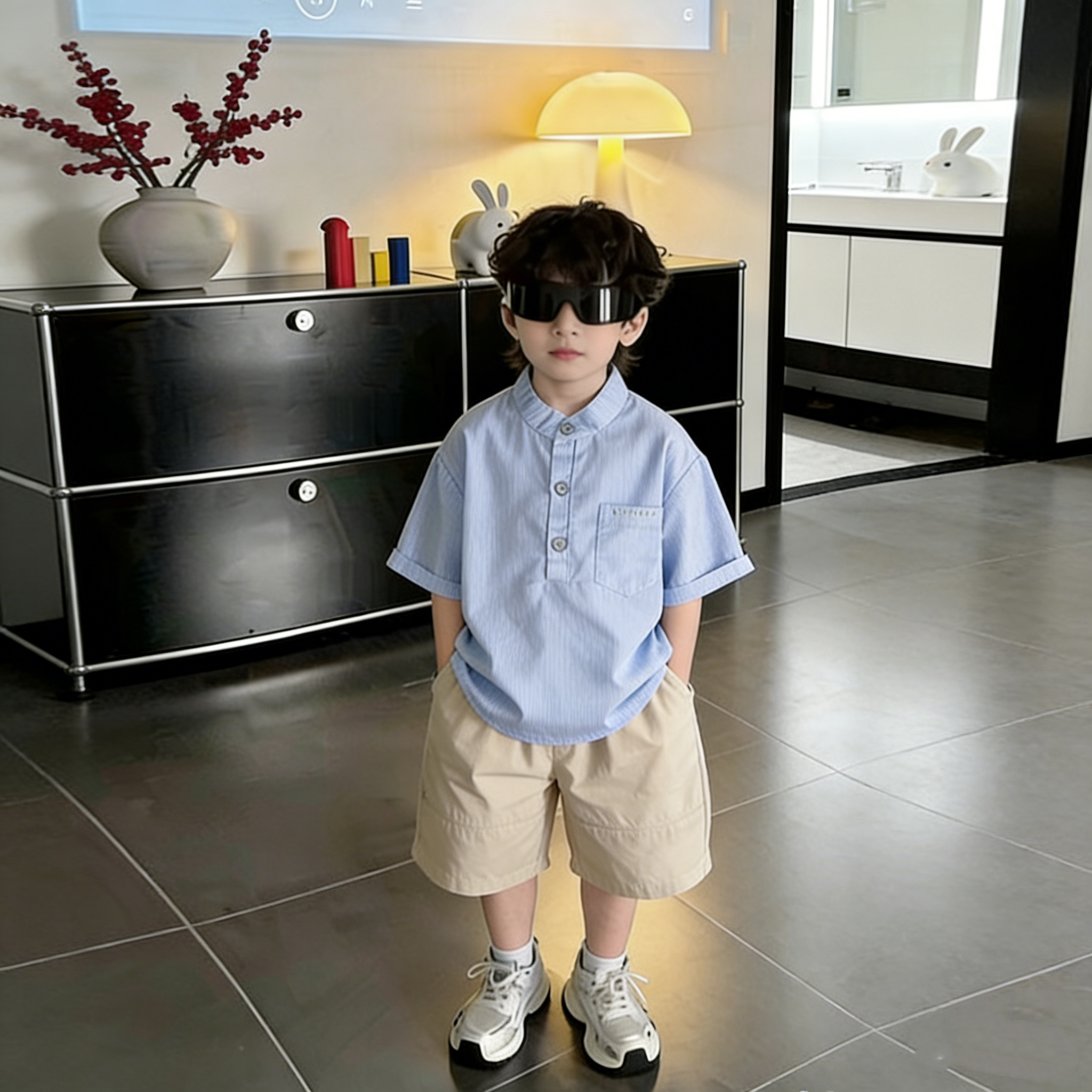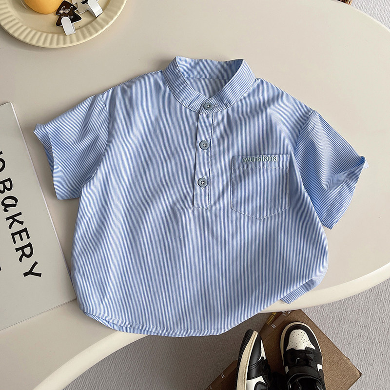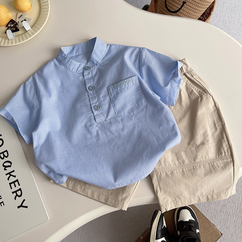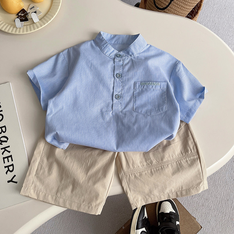 男童日系盐系蓝白条纹立领小童短袖衬衫套装衬衫男童夏季休闲套装