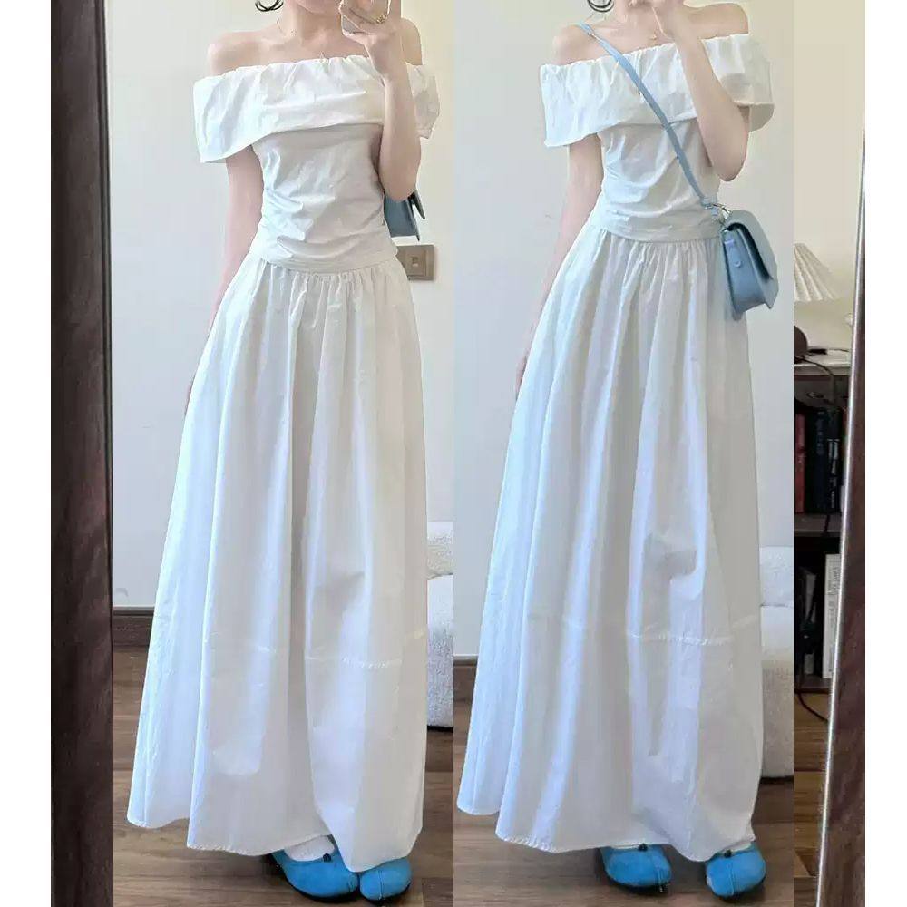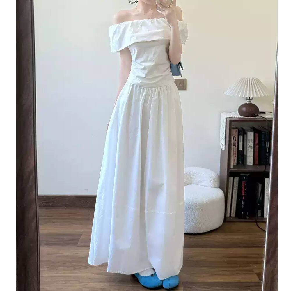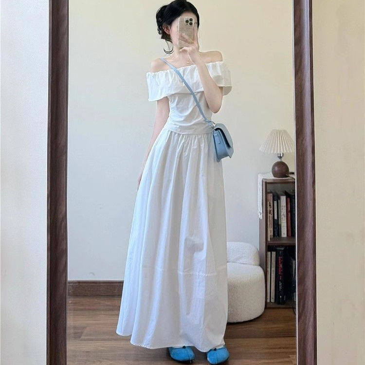 一字肩白色连衣裙子女夏季2026新款韩系清纯系白月光穿搭套装长裙