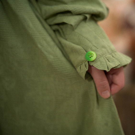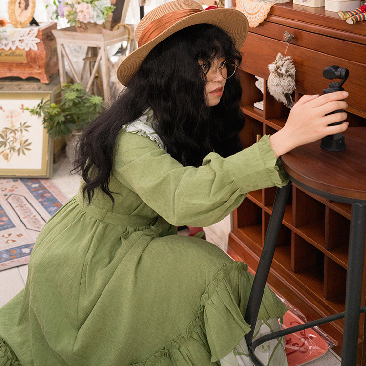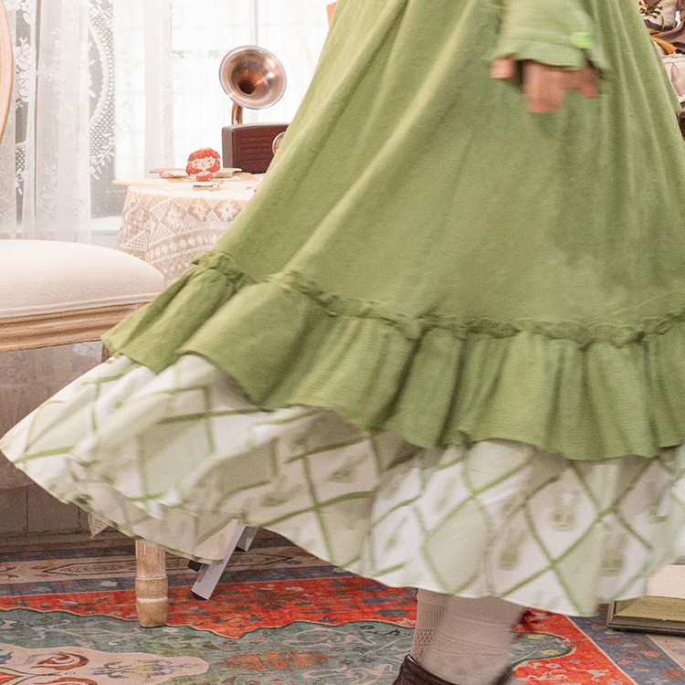 pinkwink原创格子印花设计春季绿色日常可爱甜美花边长袖连衣裙