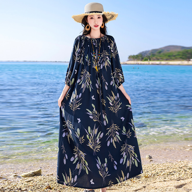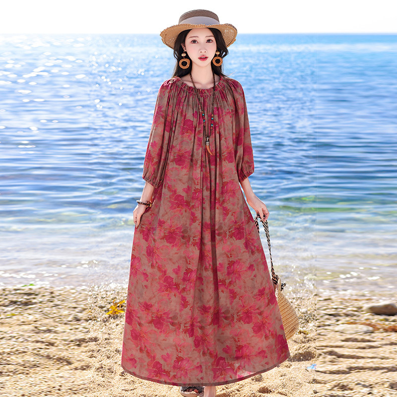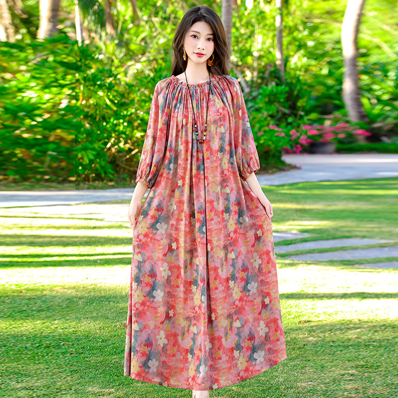 夏季薄款印花棉绸连衣裙女中年妈妈气质长裙度假风人造棉外穿裙子