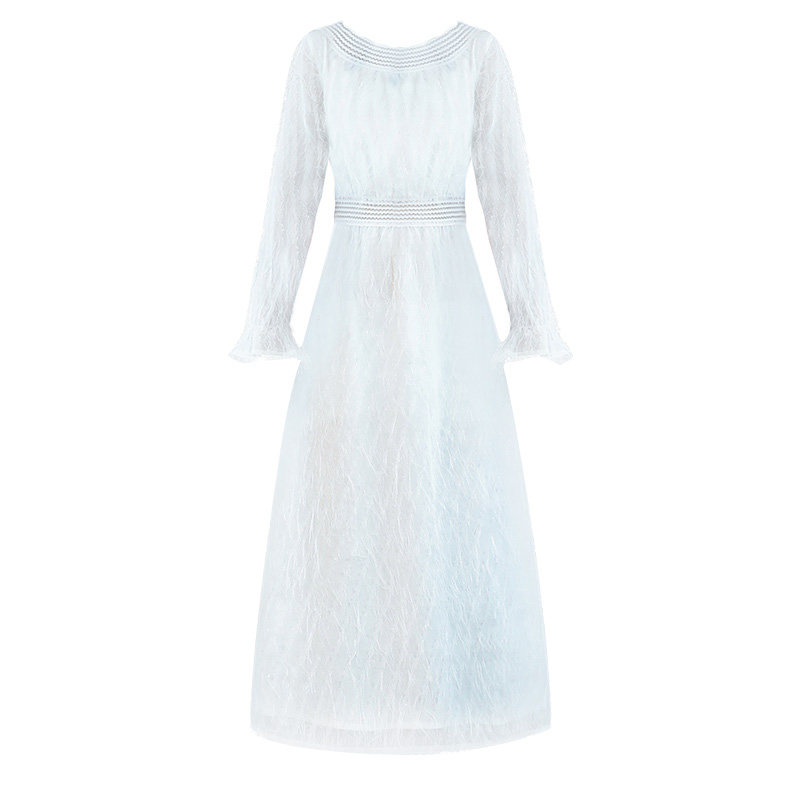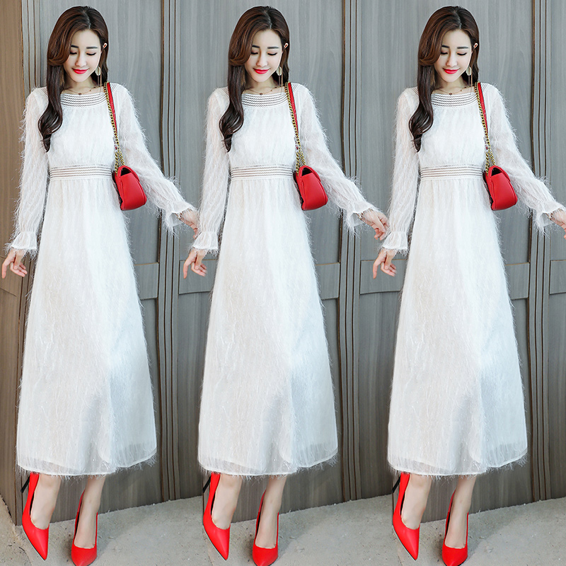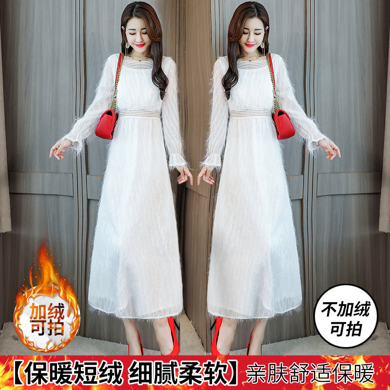 春装女2026新款白色修身秋冬裙子气质加绒加厚长袖雪纺连衣裙长裙