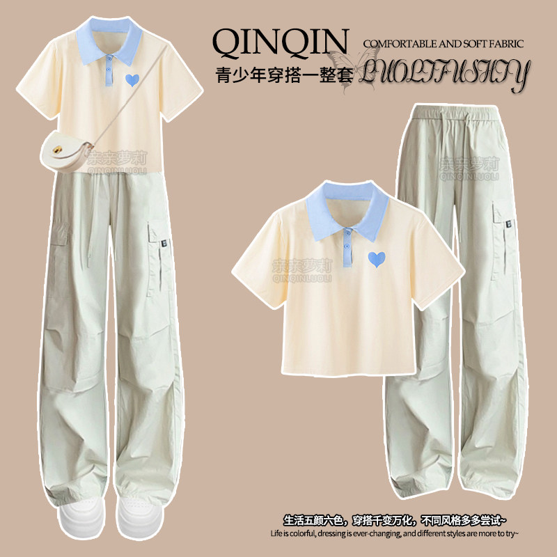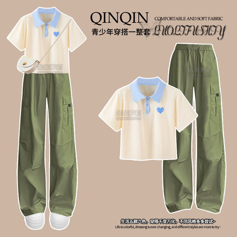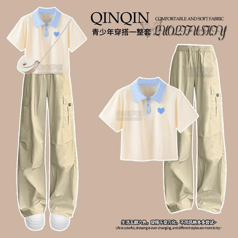女童夏季工装裤套装2025新款中大童Polo短袖T恤初中生夏装阔腿裤