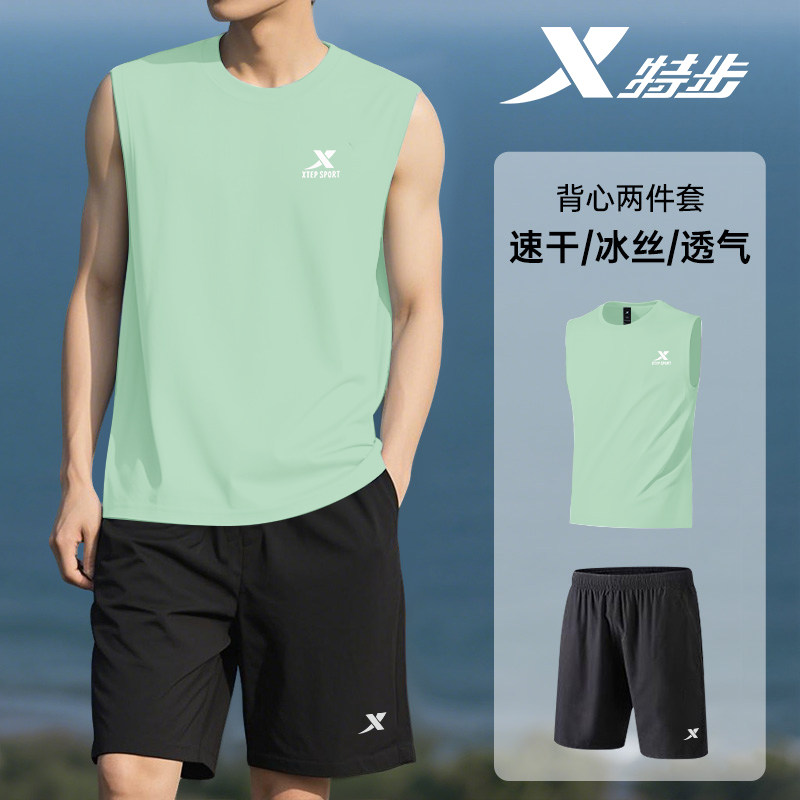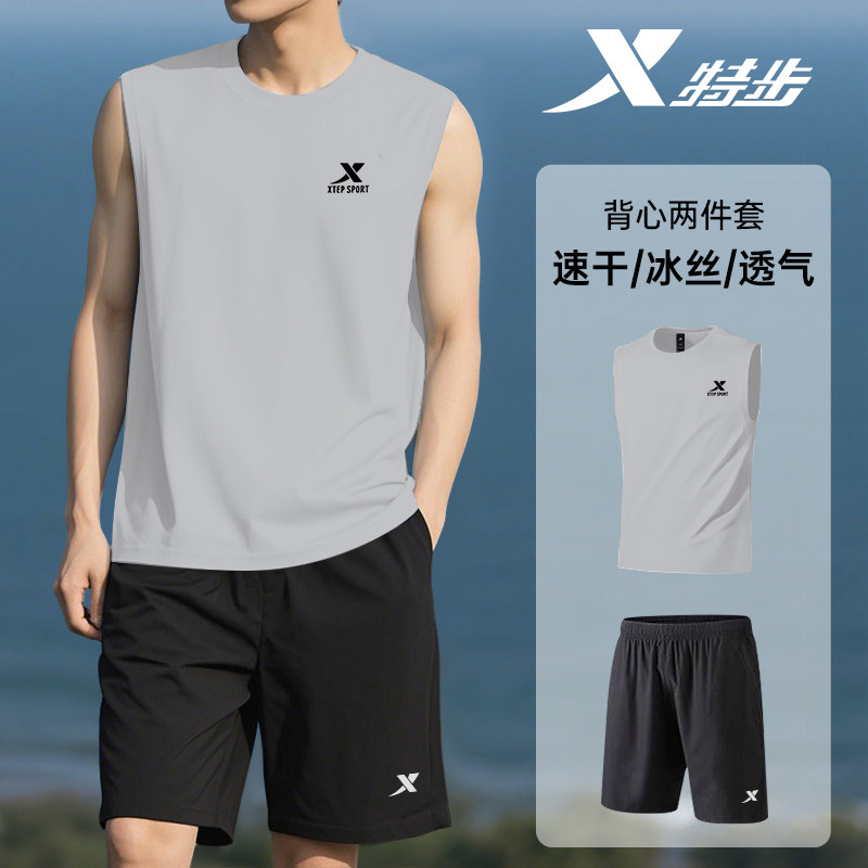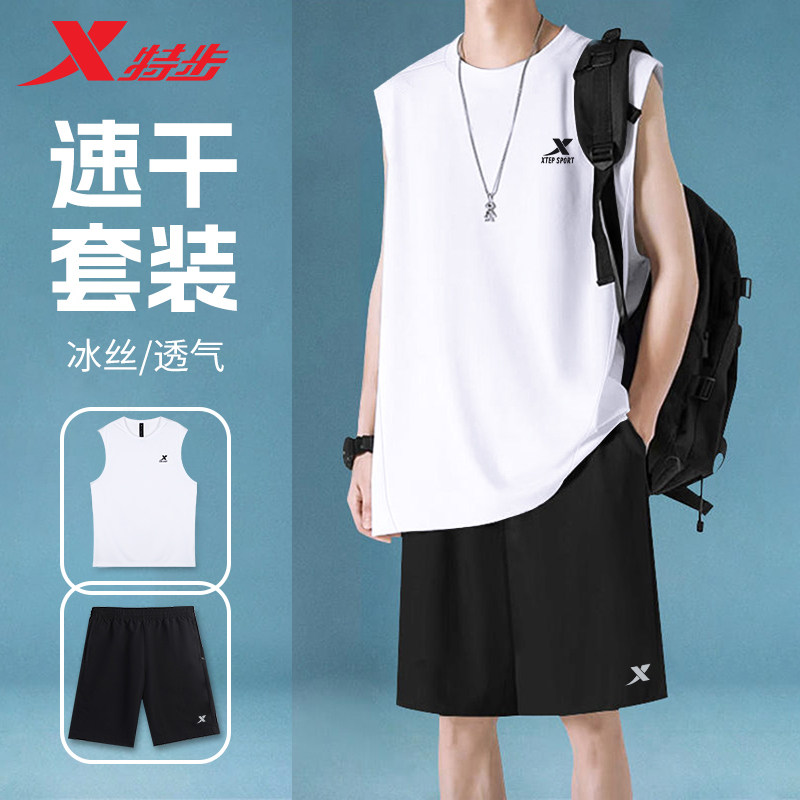 特步跑步背心套装男夏季新款无袖坎肩T恤短裤速干马拉松运动服男