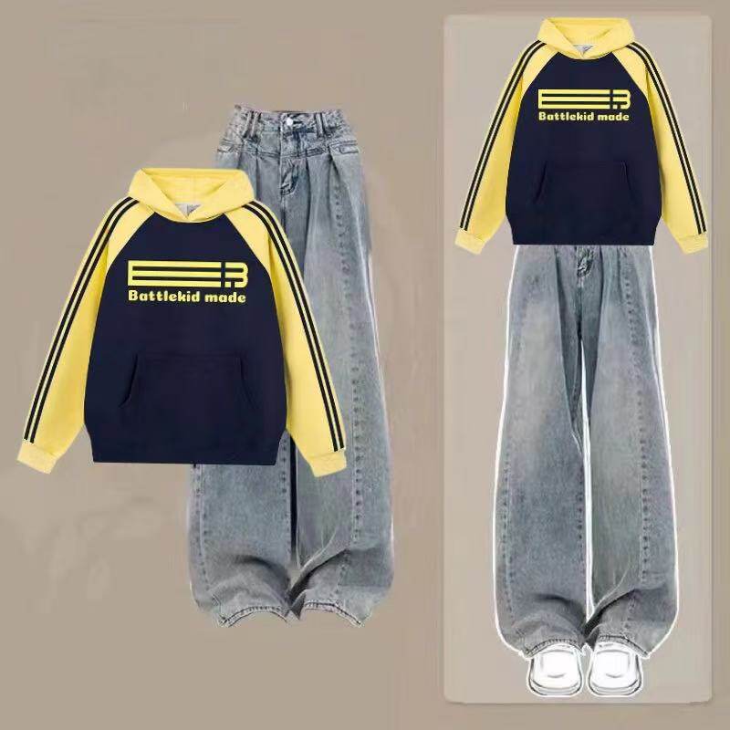 初中生秋季插色外套女大童宽松卫衣青少年高中学生牛仔裤穿搭套装