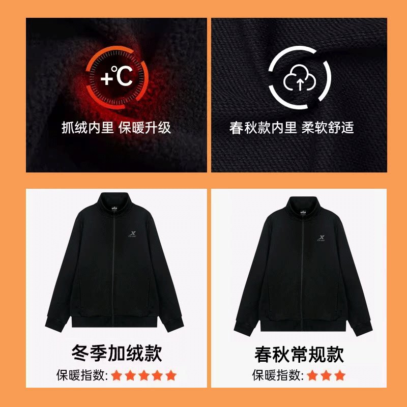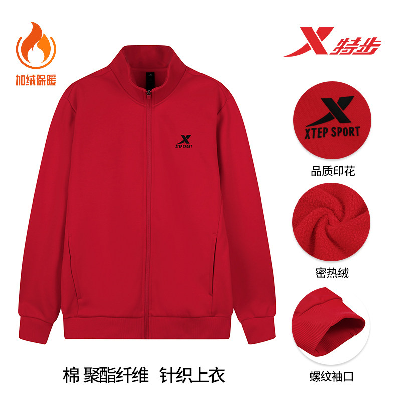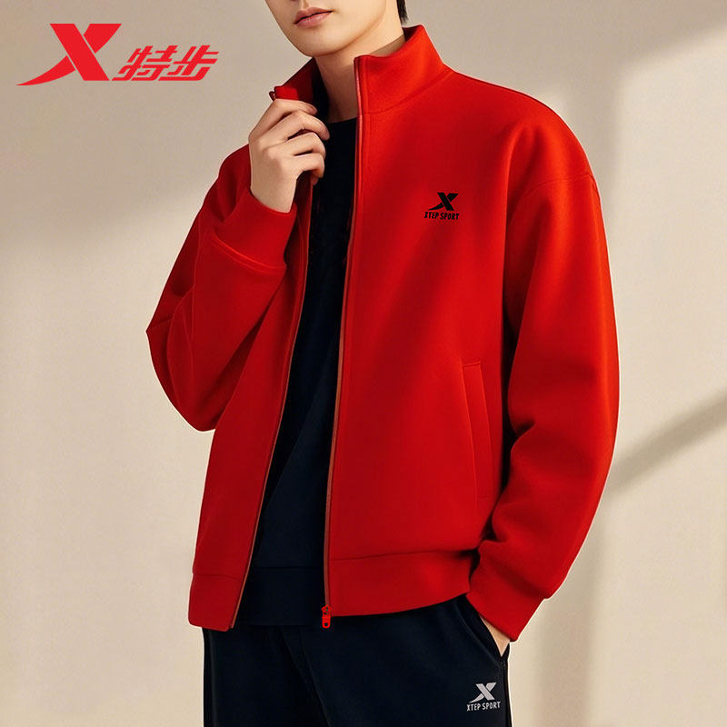 特步夹克外套男款2026秋冬新款红色立领开衫外套加绒运动服上衣男