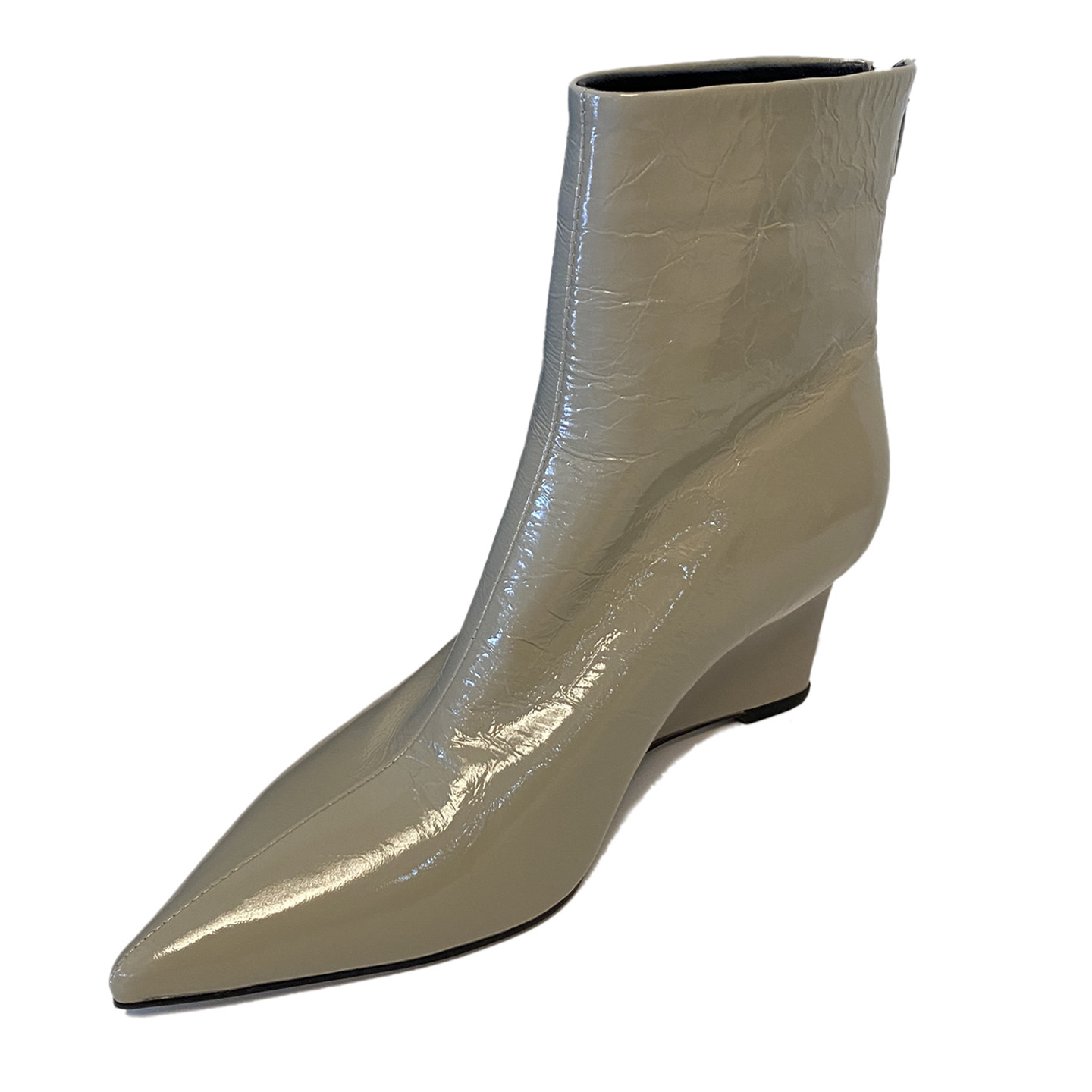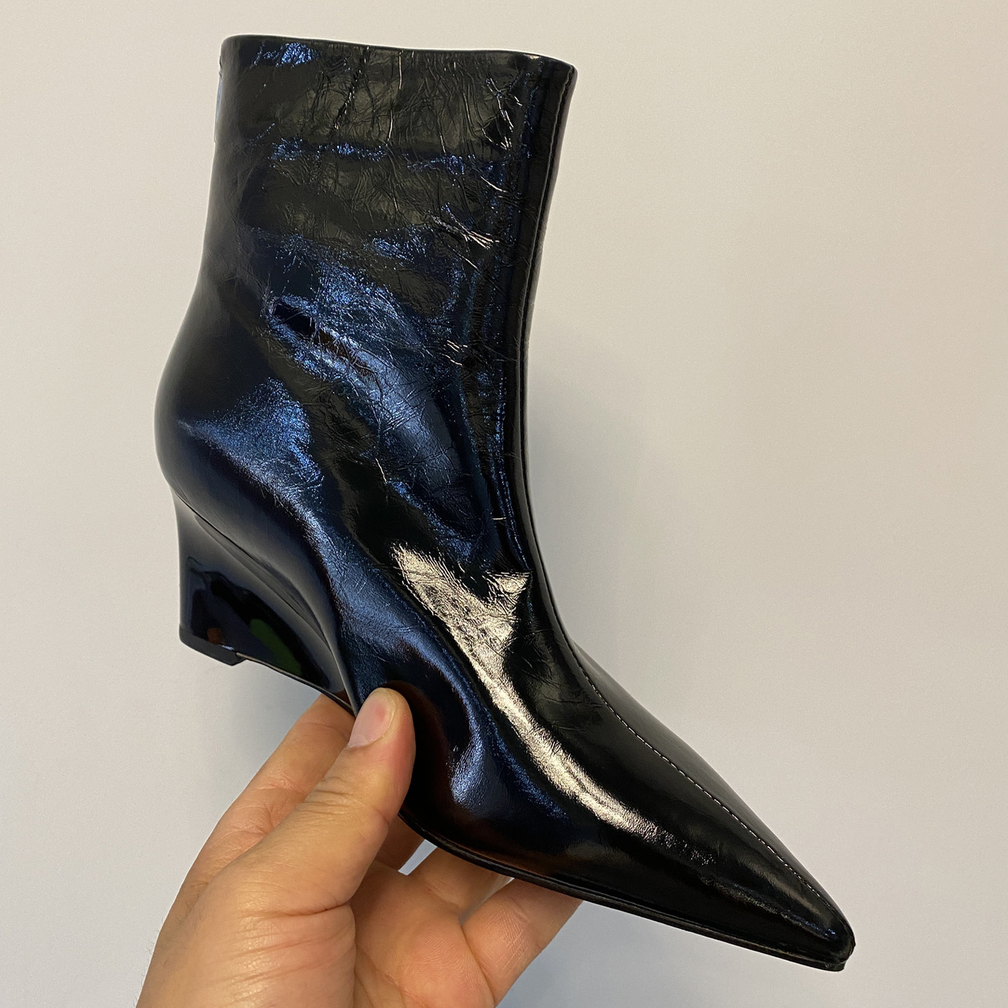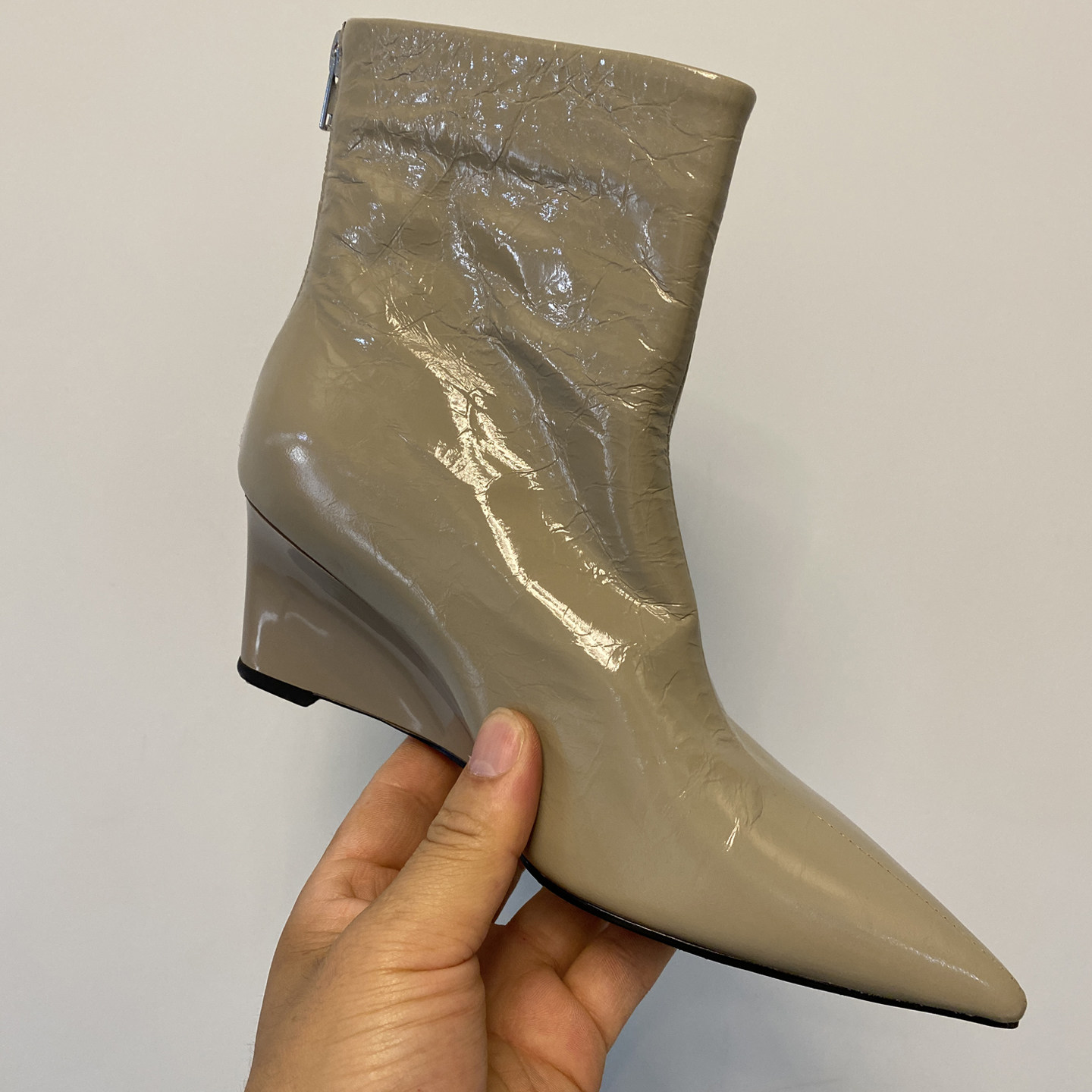 手工真皮高跟尖头坡跟短靴女后拉链复古炸裂纹头层牛皮显瘦裸靴女
