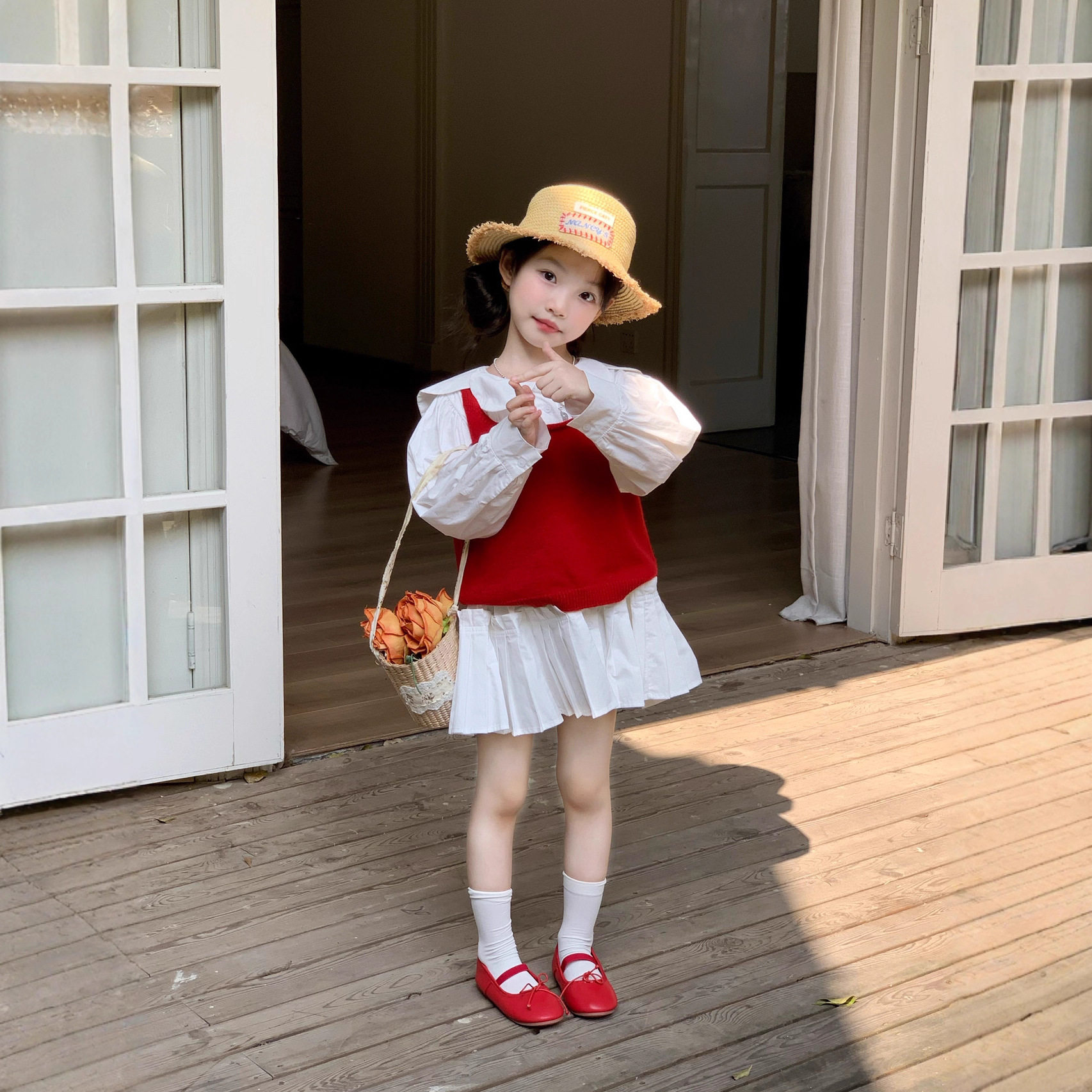 2025秋季新款童装儿童红色毛衣背心女童长袖百褶裙边大翻领衬衫裙