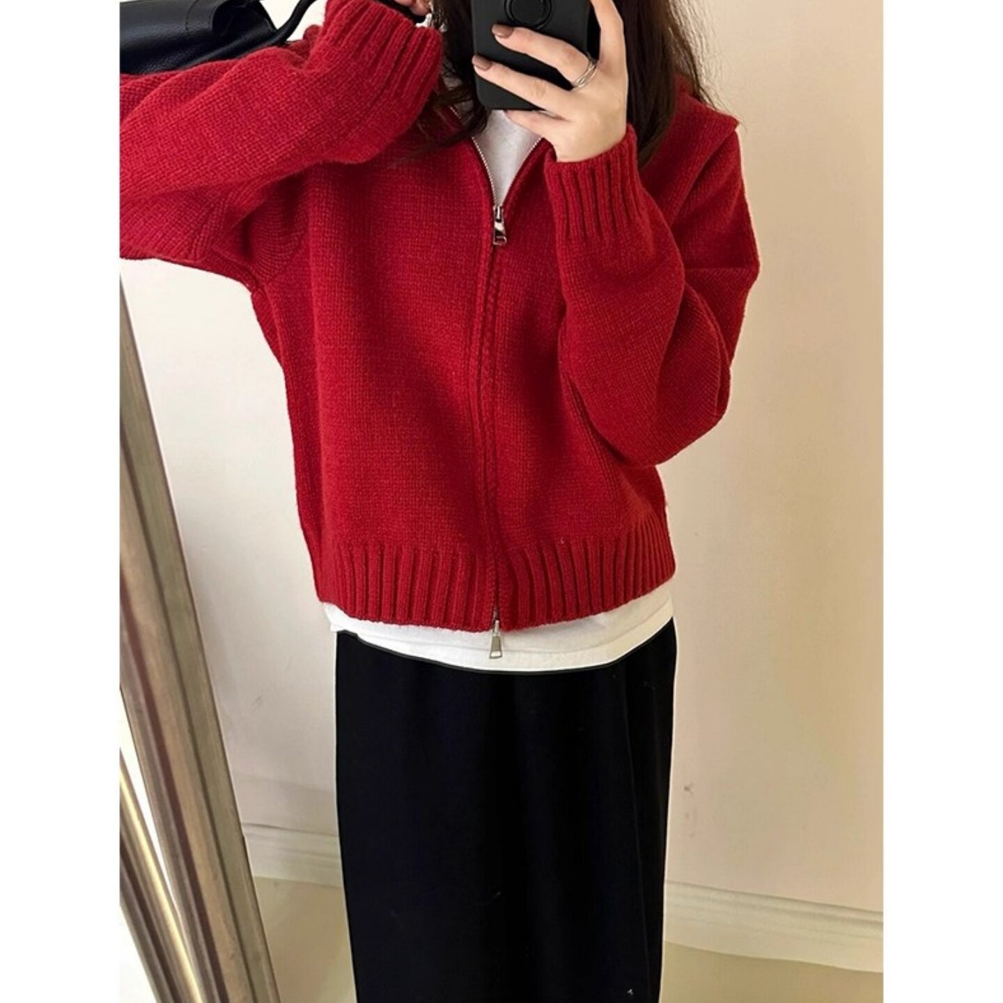 红色连帽毛衣拉链开衫女款2026新款秋冬季韩系慵懒风短款针织外套
