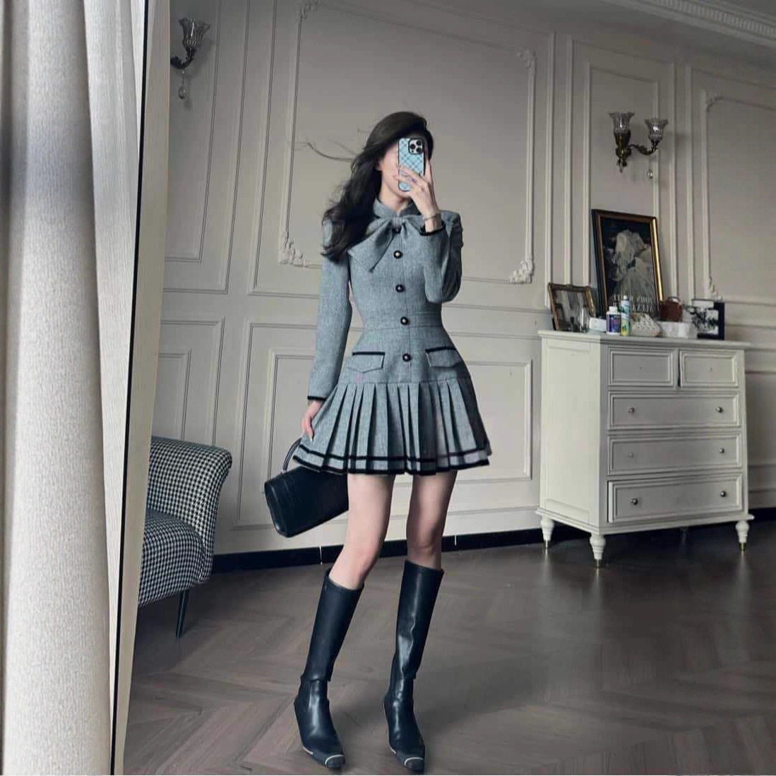 秋冬法式富家千金高级感气质轻奢灰色拼接蝴蝶结收腰短款连衣裙女