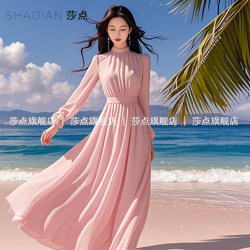 粉色连衣裙女春秋2026新款长袖气质收腰海边度假长裙沙滩裙大摆裙