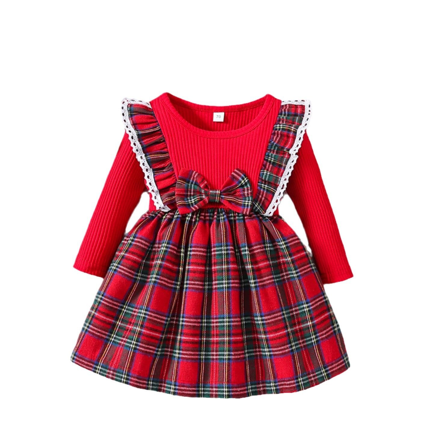 韩版春秋新款公主裙蝴蝶结长袖连衣裙甜美格子花边儿童雪纺裙子
