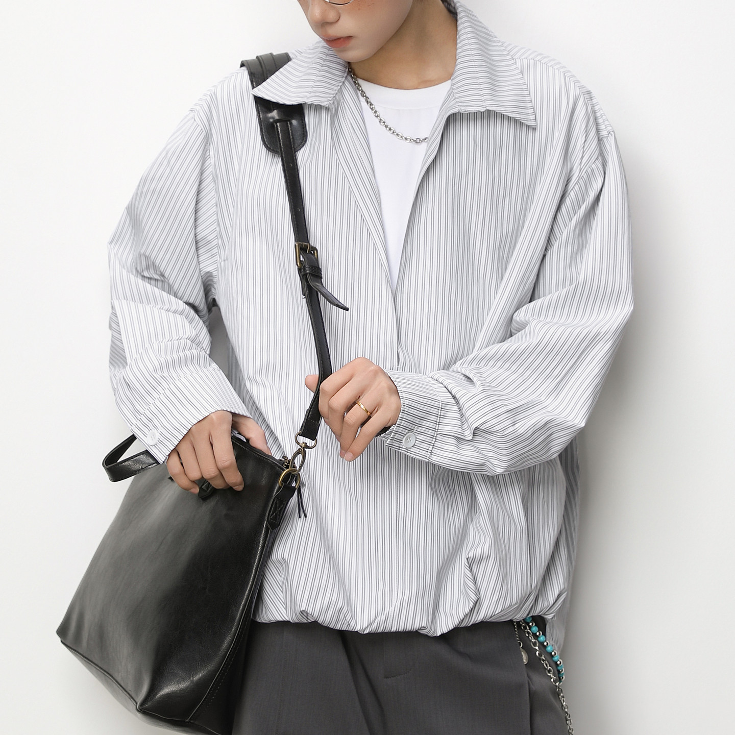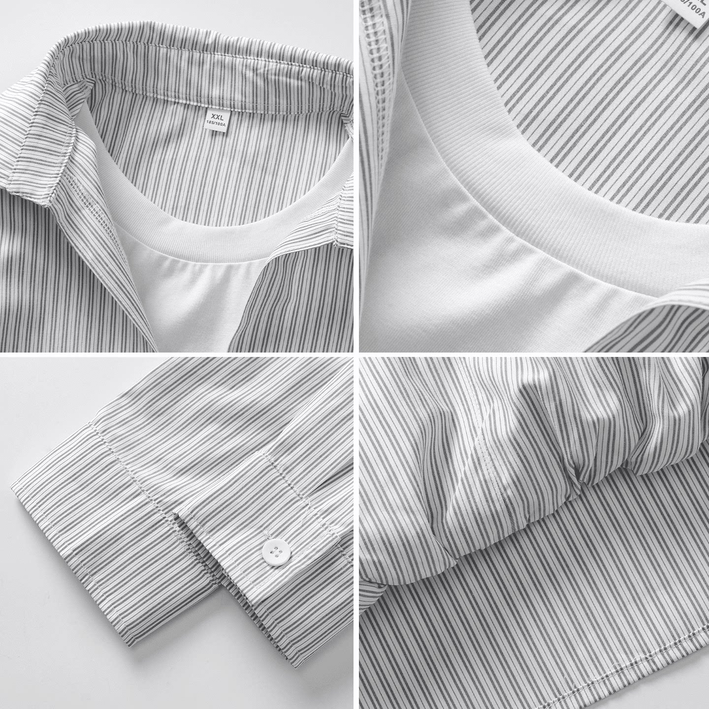 男生春季条纹假两件衬衫男长袖2026新款深v休闲上衣男款衬衣外套