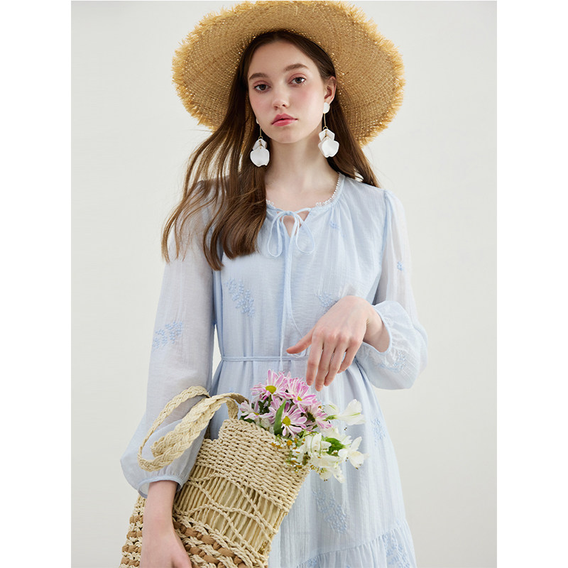 KBNE蓝色法式连衣裙长袖2025夏季新款气质裙子小个子慵懒长裙女装