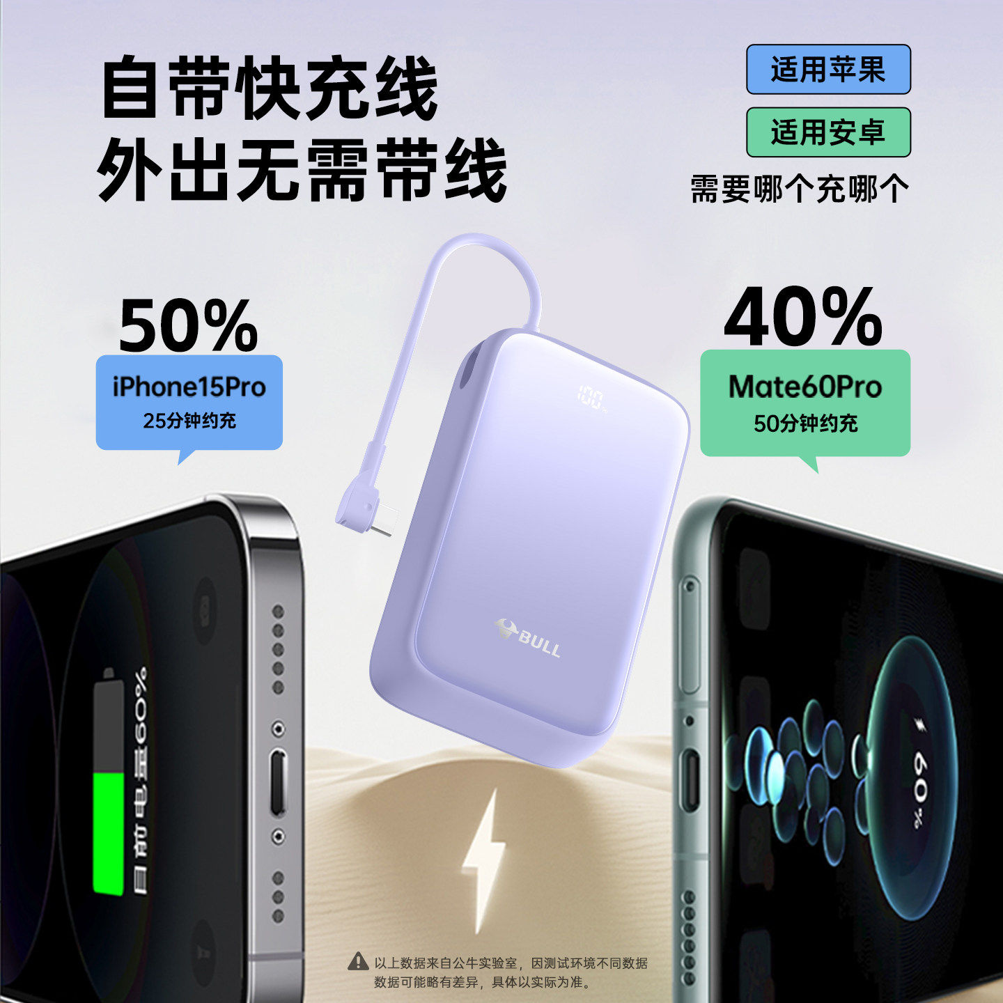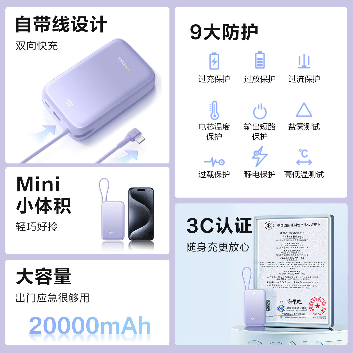 【3c认证】公牛充电宝20000毫安快充大容量2025新款自带线可带上飞机高铁火车华为苹果17小巧便携式移动电源