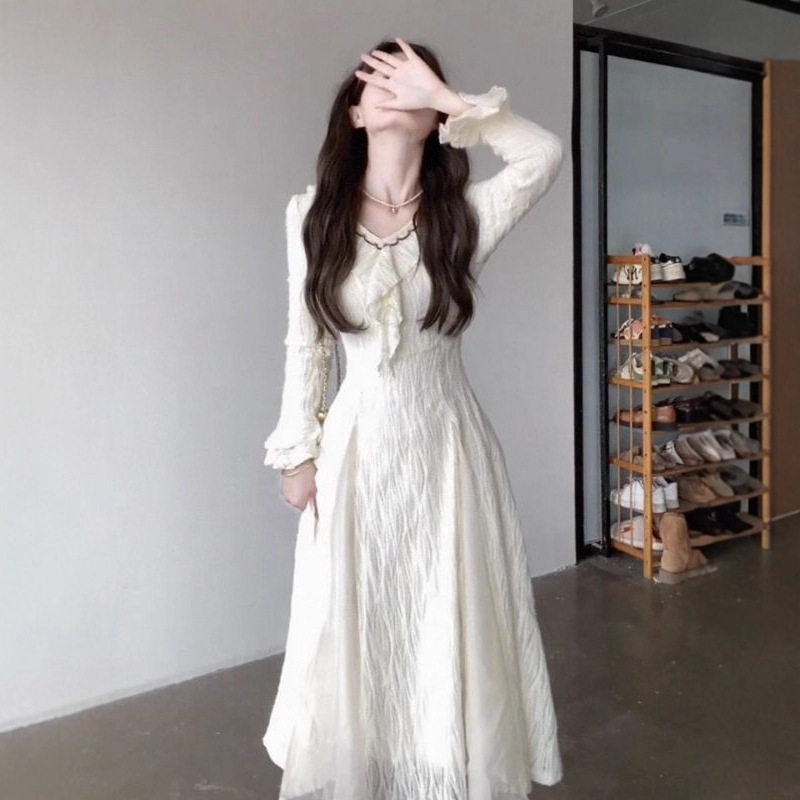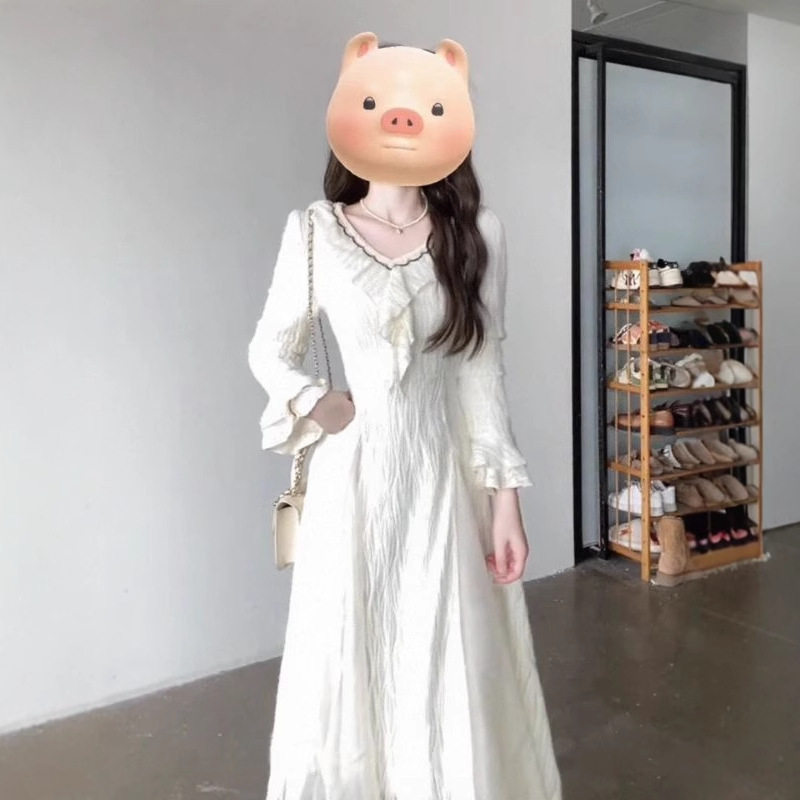法式温柔风V领连衣裙女早秋新款设计感收腰肌理感清纯气质A字长裙