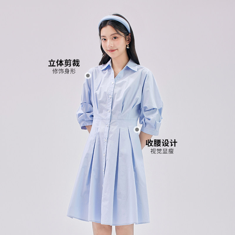 达佳诗蓝色裙子女夏日新款褶皱掐腰蓝裙小个子日常通勤短袖连衣裙