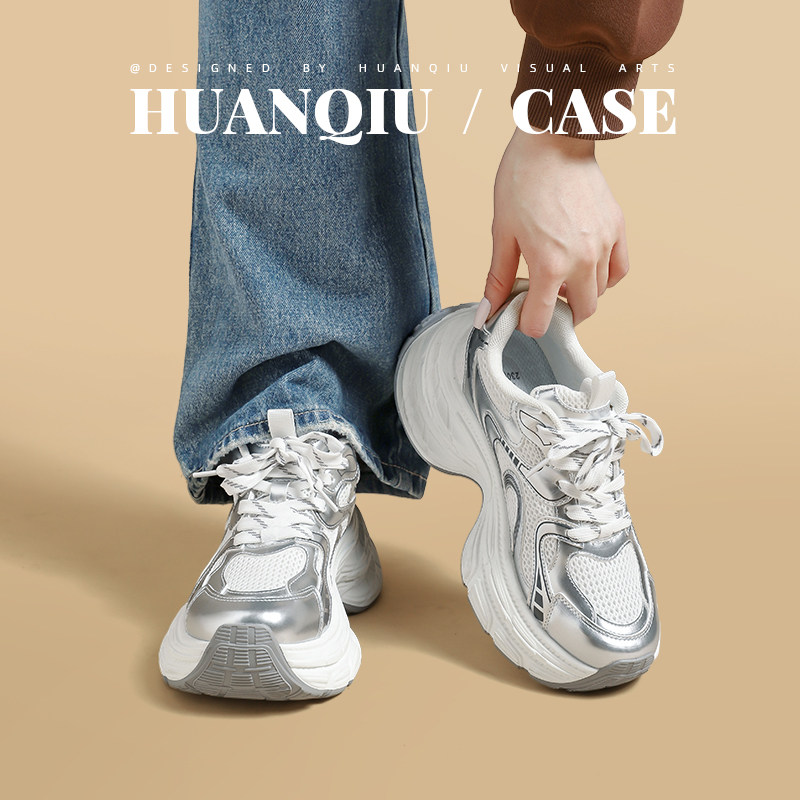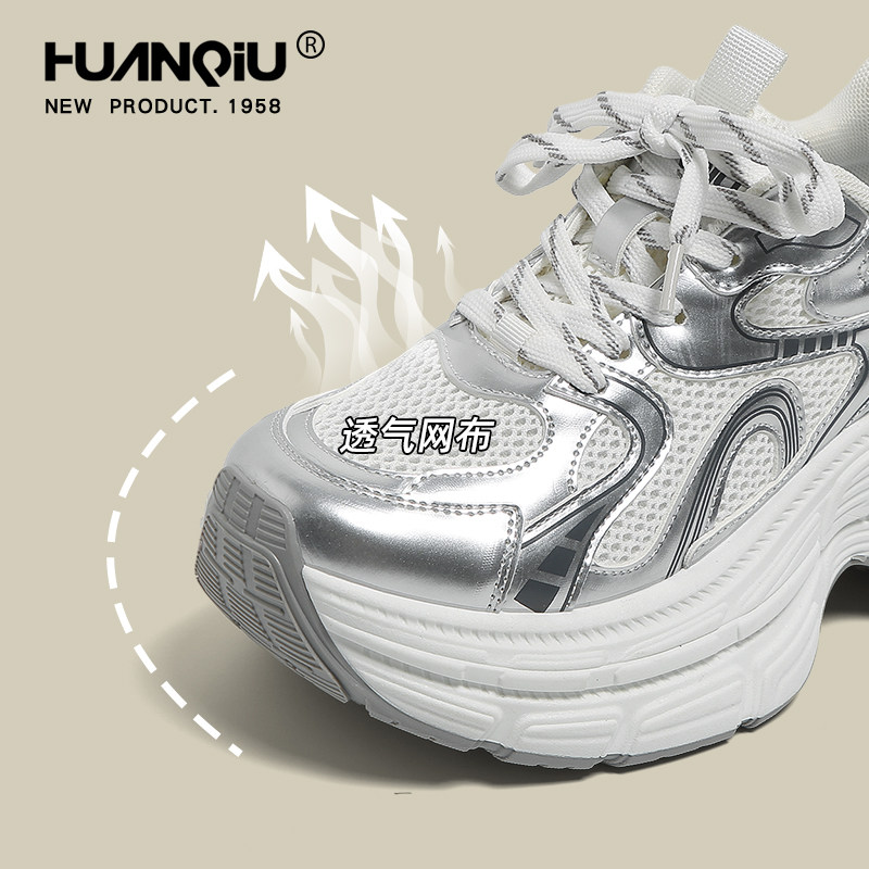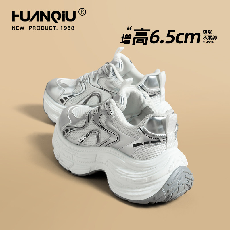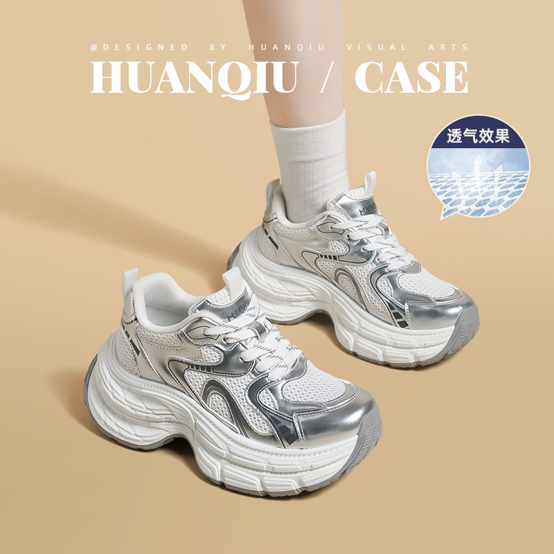 环球银色老爹鞋女款夏季透气薄款厚底增高小个子轻便不累脚运动鞋