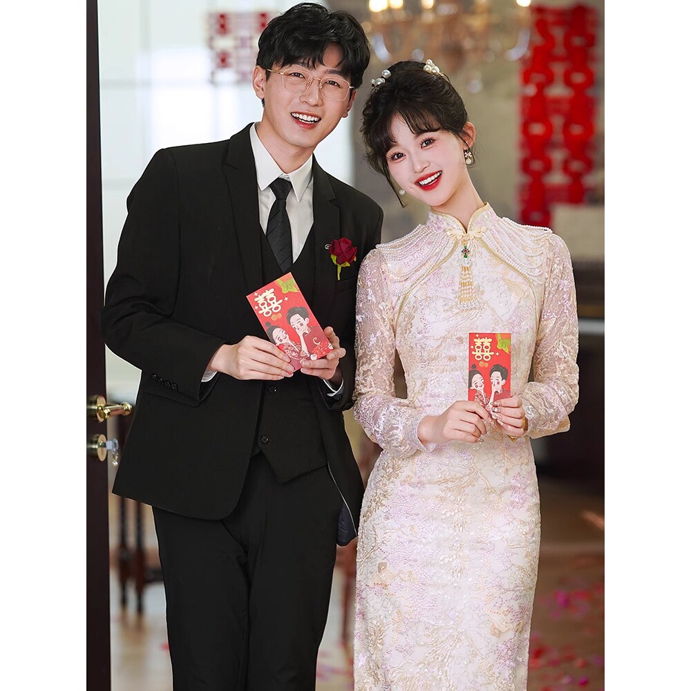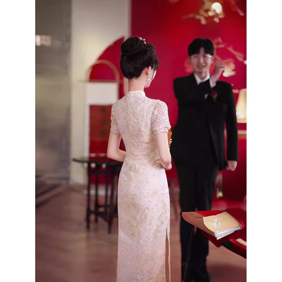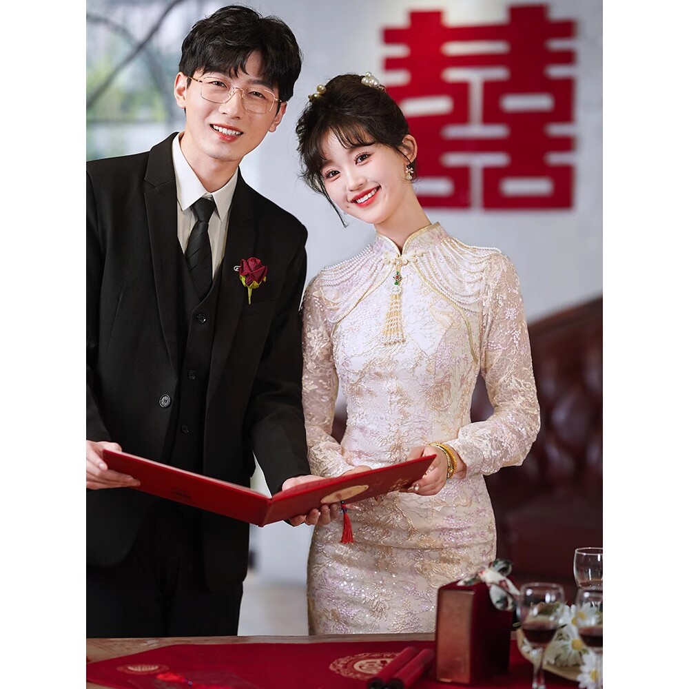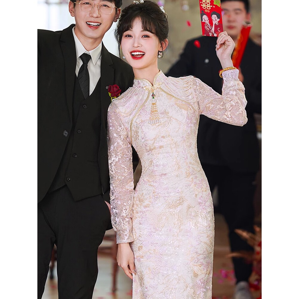 旗袍敬酒服高级新娘复古结婚答谢宴礼服女订婚气质连衣裙长袖夏季