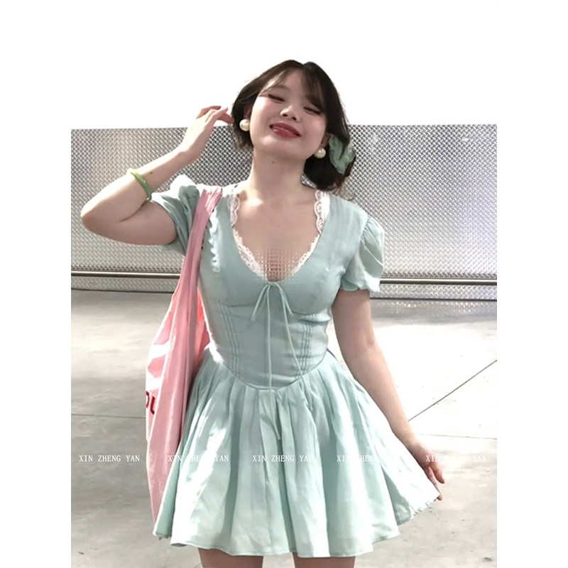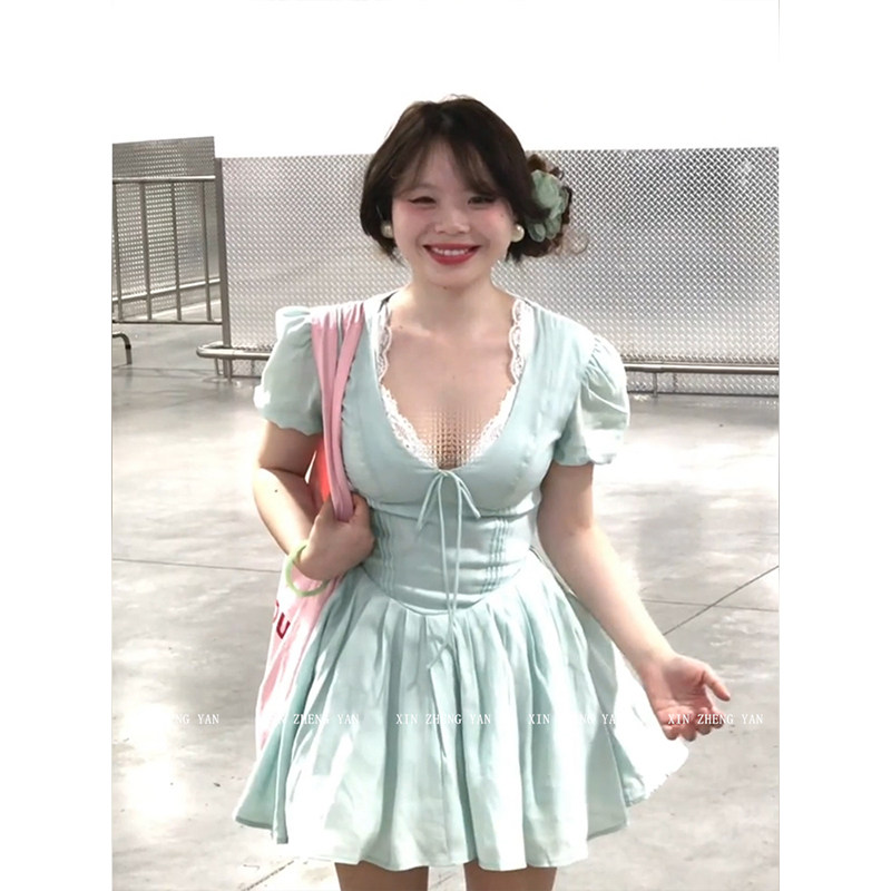 XZY/欣争艳 微胖mm薄荷曼波绿色V领连衣裙女25年夏海边度假公主裙