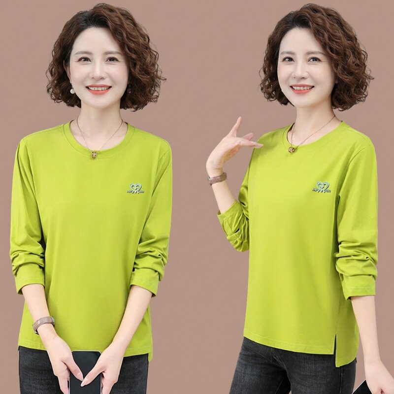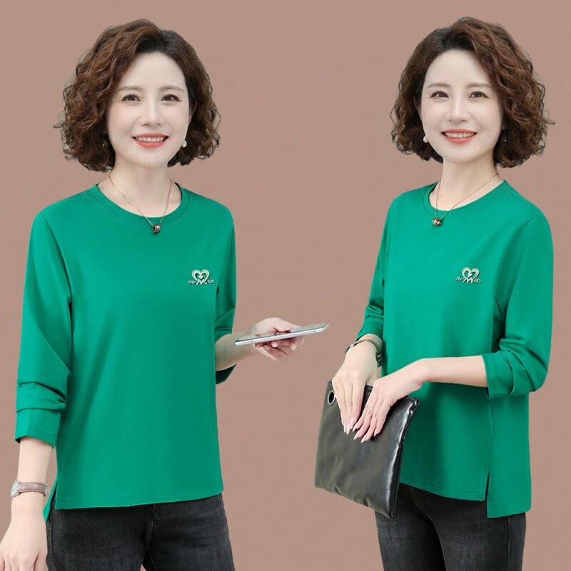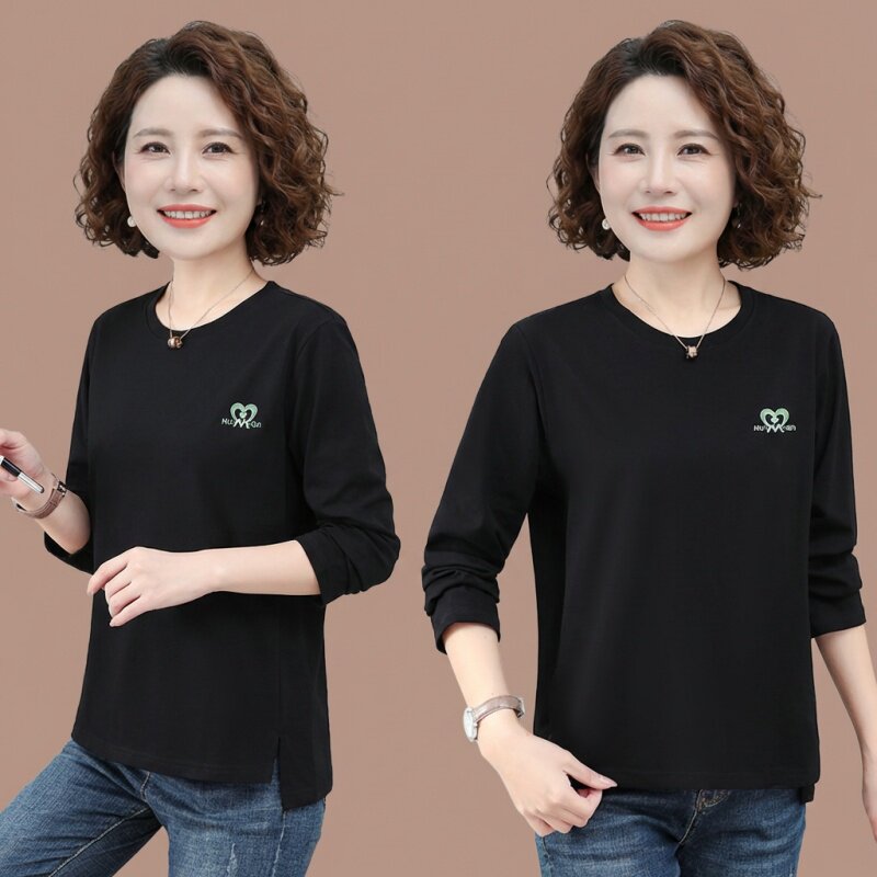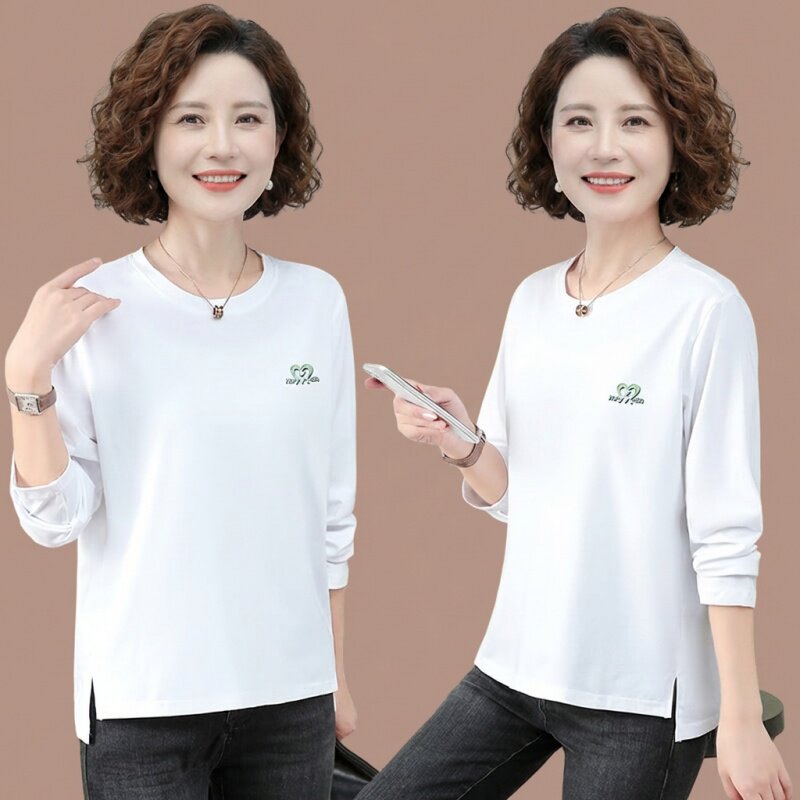 纯棉长袖t恤女中年妈妈圆领打底衫50岁春装女款打底衫内搭上衣女