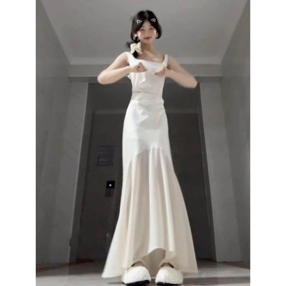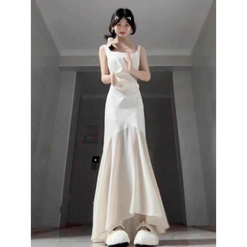 法式白色无袖吊带连衣裙女装夏季2025新款小个子收腰显瘦鱼尾长裙