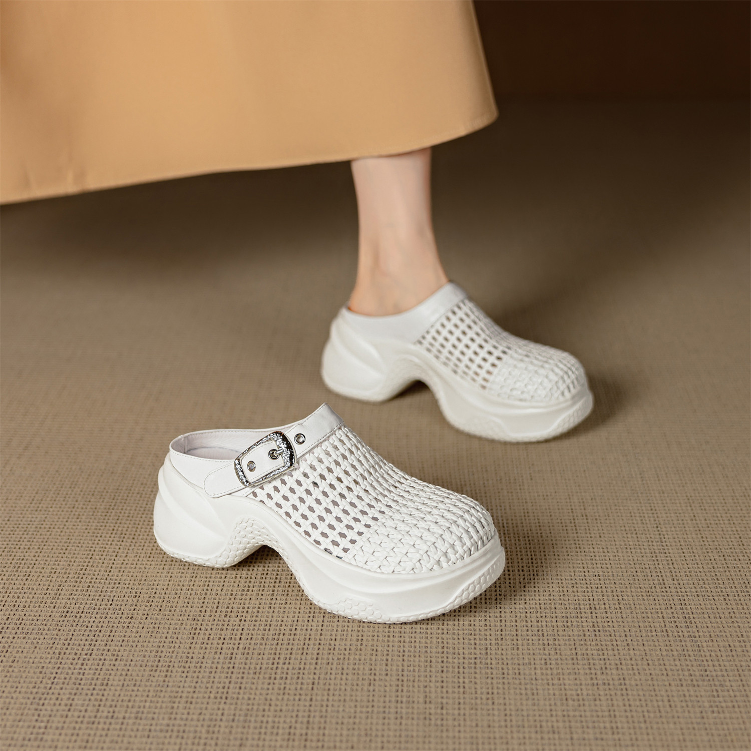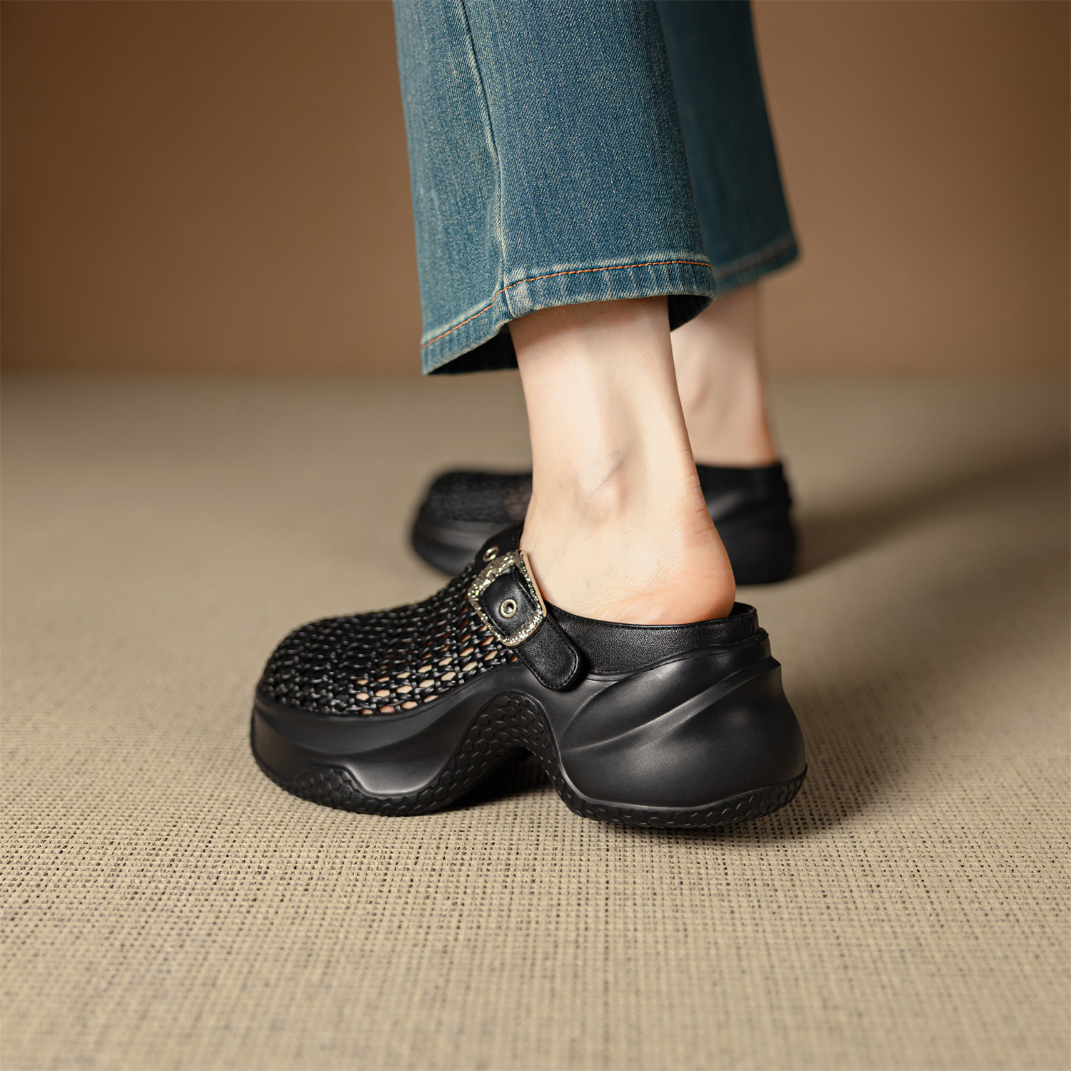 港风编织镂空洞洞凉拖鞋高跟春夏新款女鞋增高外穿厚底包头半拖鞋