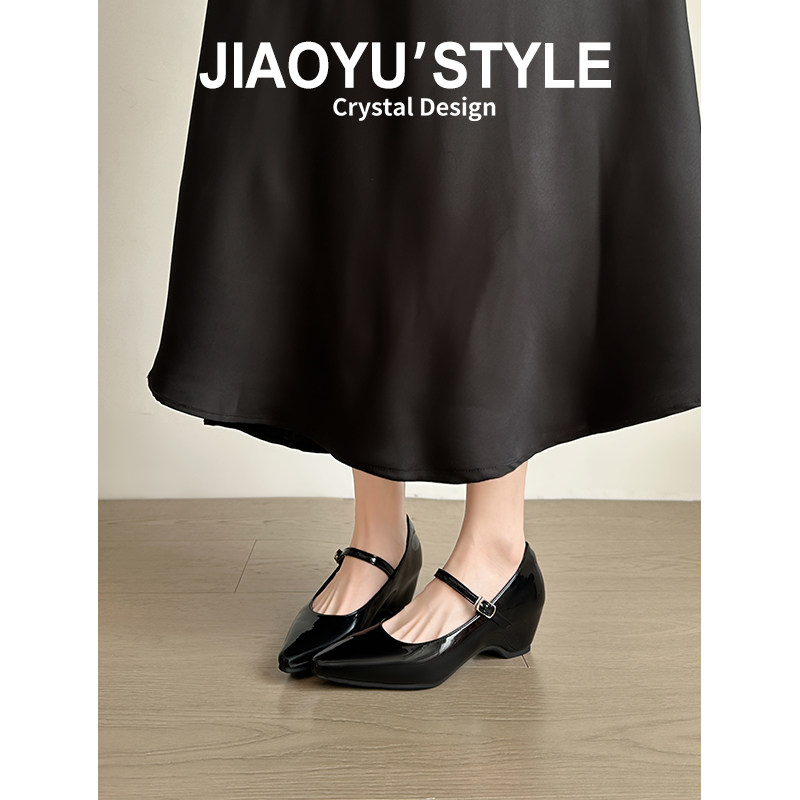 真皮~骄屿 裸色玛丽珍鞋女尖头粗跟高跟鞋法式绝美新款内增高单鞋