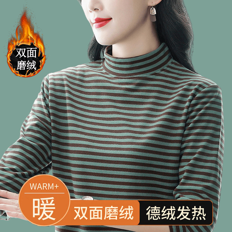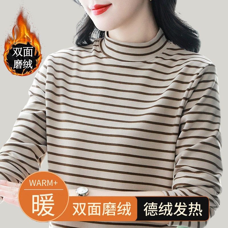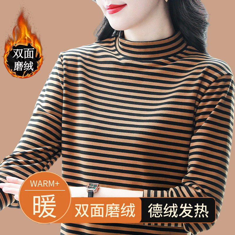 德绒条纹打底衫女秋冬款加绒加厚双面磨毛保暖宽松内搭上衣可外穿