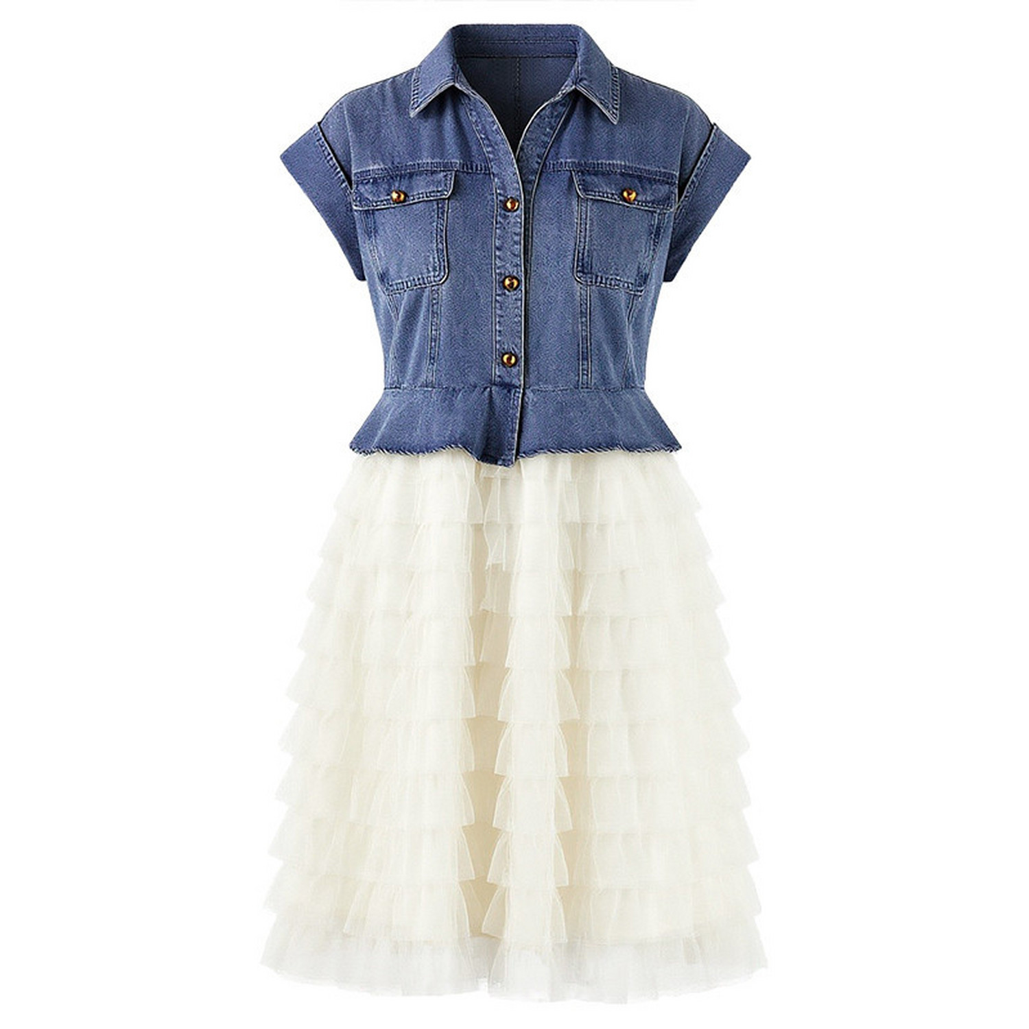 秋水伊人温柔拼接蛋糕网纱连衣裙2026年夏季新款经典翻领设计裙子