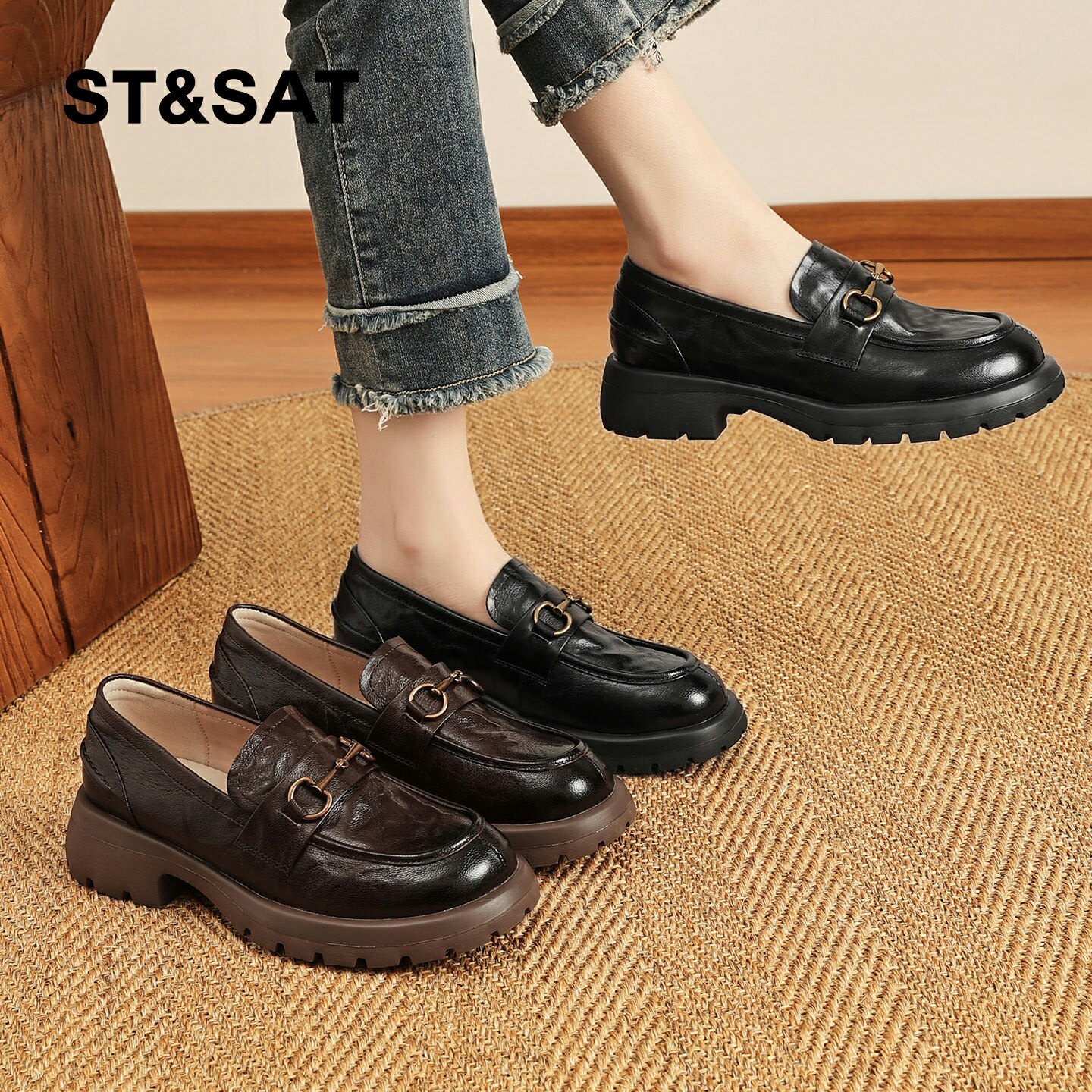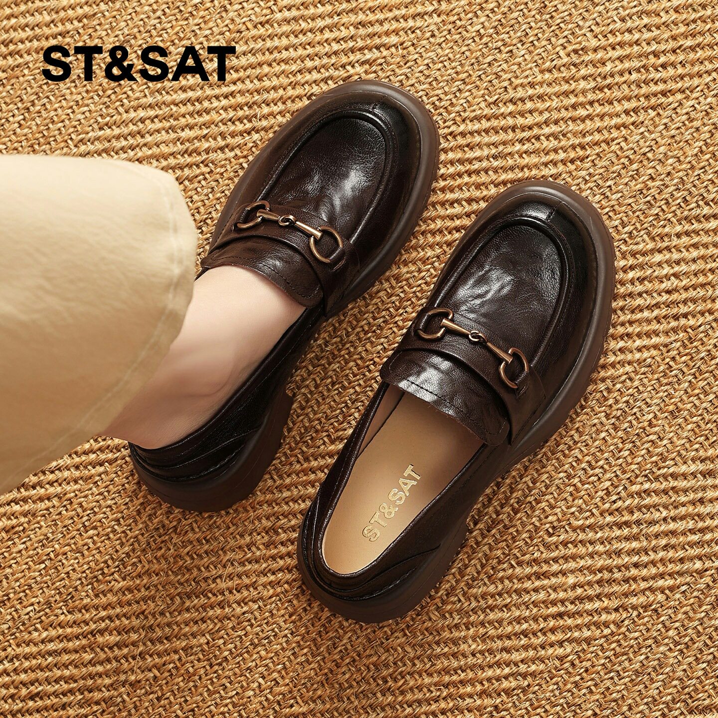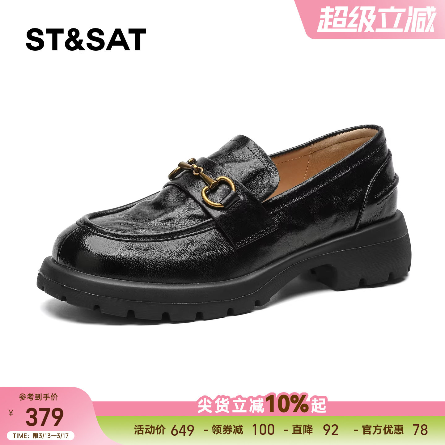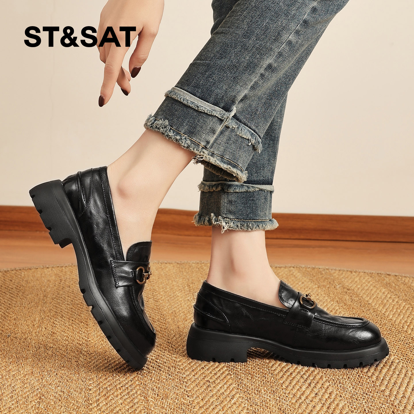 星期六真皮粗跟乐福鞋女春季新款英伦风简约复古小皮鞋豆豆鞋