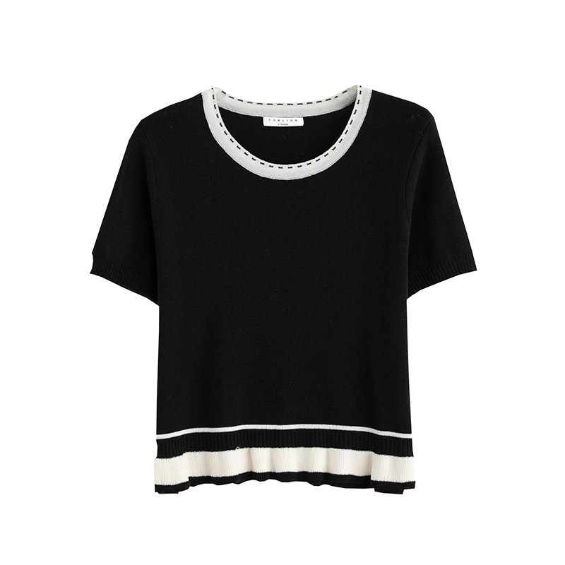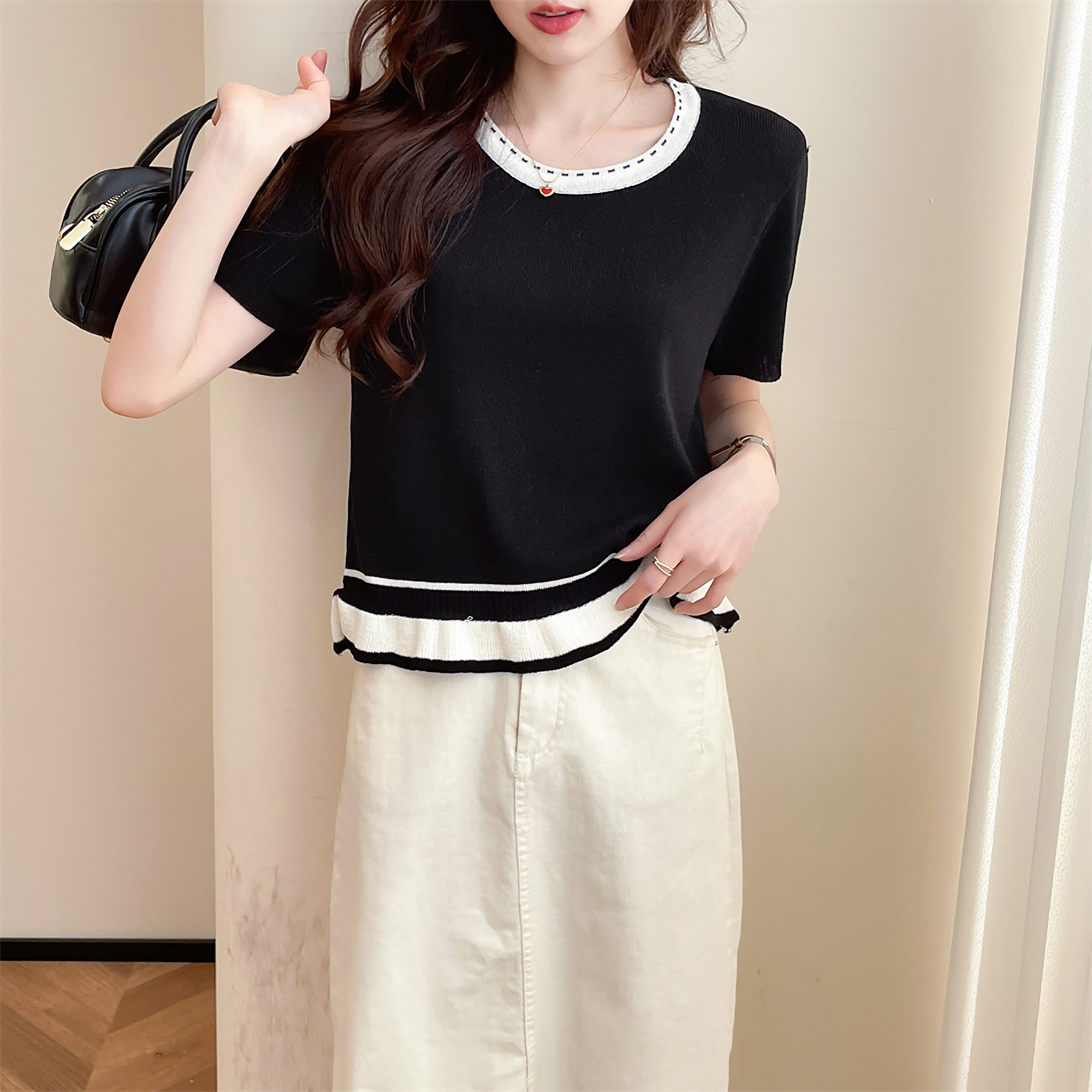 唐狮薄款针织衫女款2026夏季新款撞色花边设计感宽松短袖T恤上衣