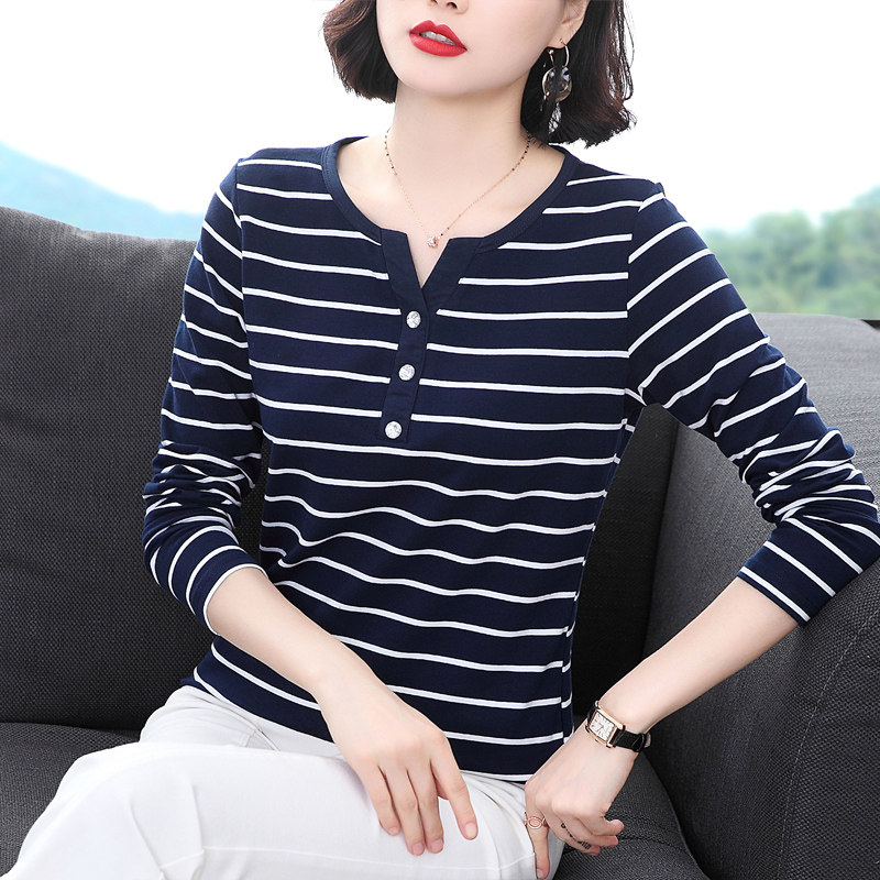 纯棉长袖t恤女v领上衣中老年女装妈妈春季2026新款条纹内搭打底衫