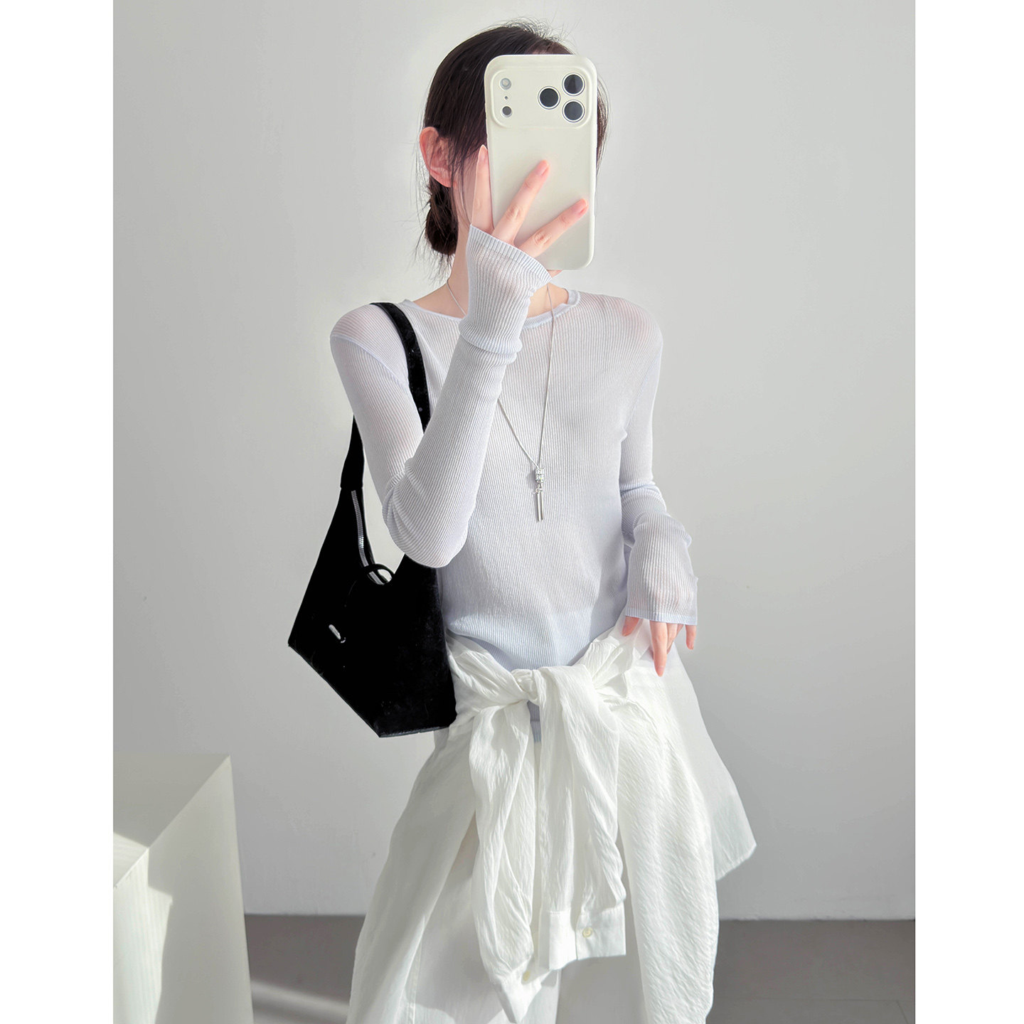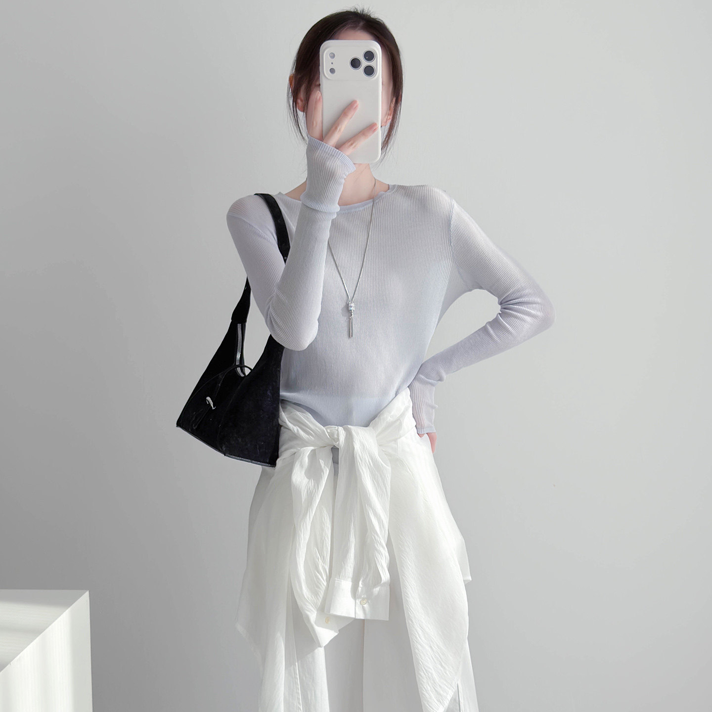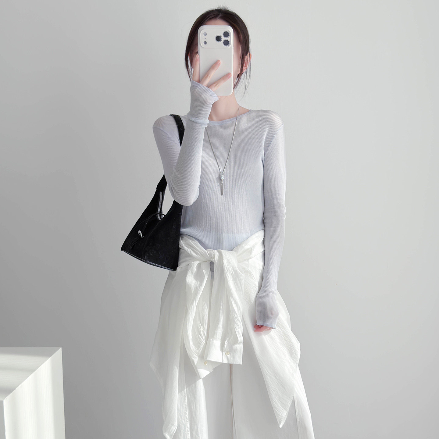纸片人 蓝色微透长绒棉针织衫女款2026春夏装修身轻薄款打底上衣