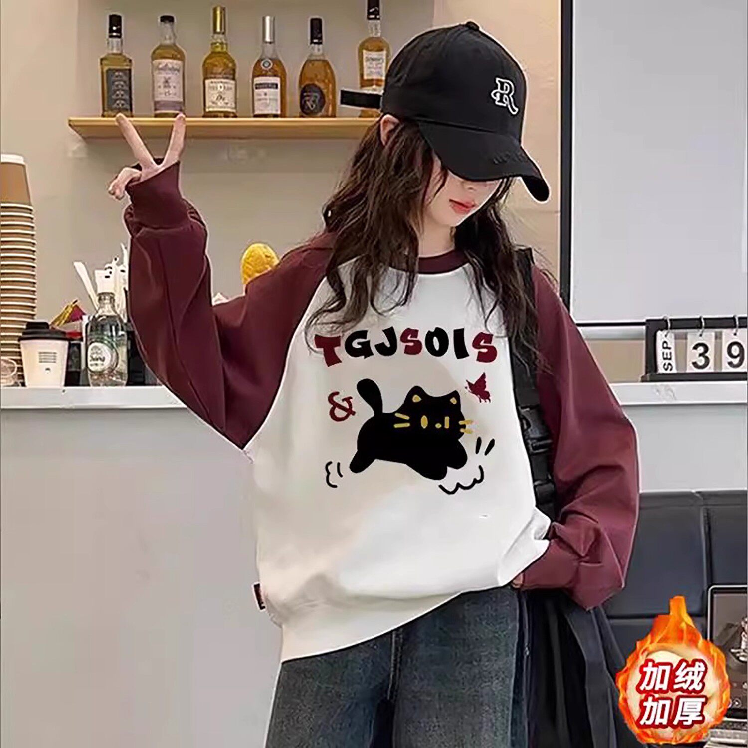慵懒chic插肩袖卫衣女童酒红冬季加绒新款宽松圆领无帽春秋打底衫