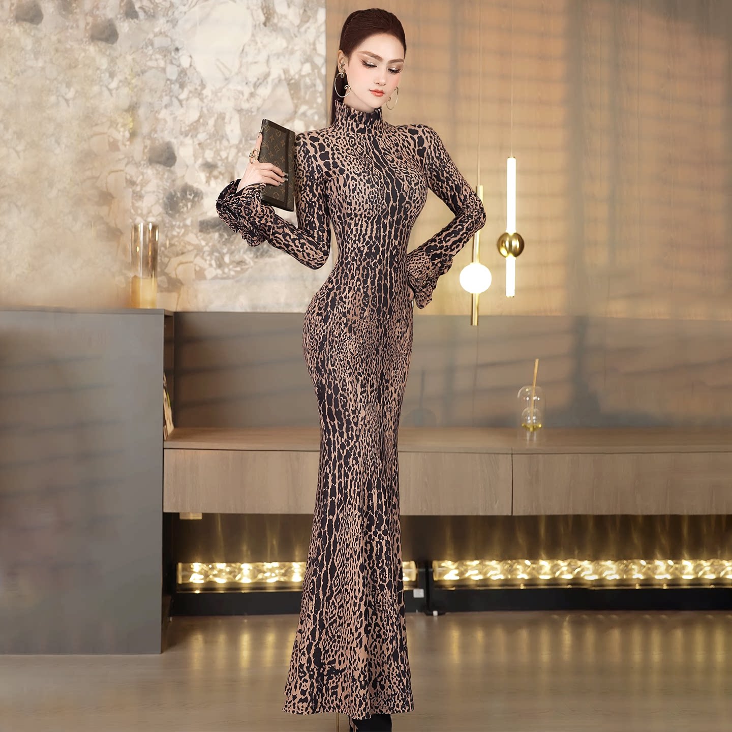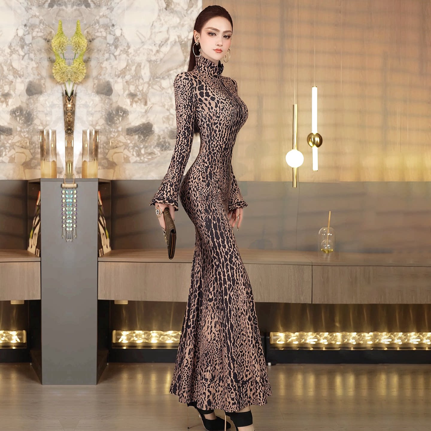 早春性感豹纹轻熟风长袖荷叶边连衣裙2026新款气质收腰包臀鱼尾裙